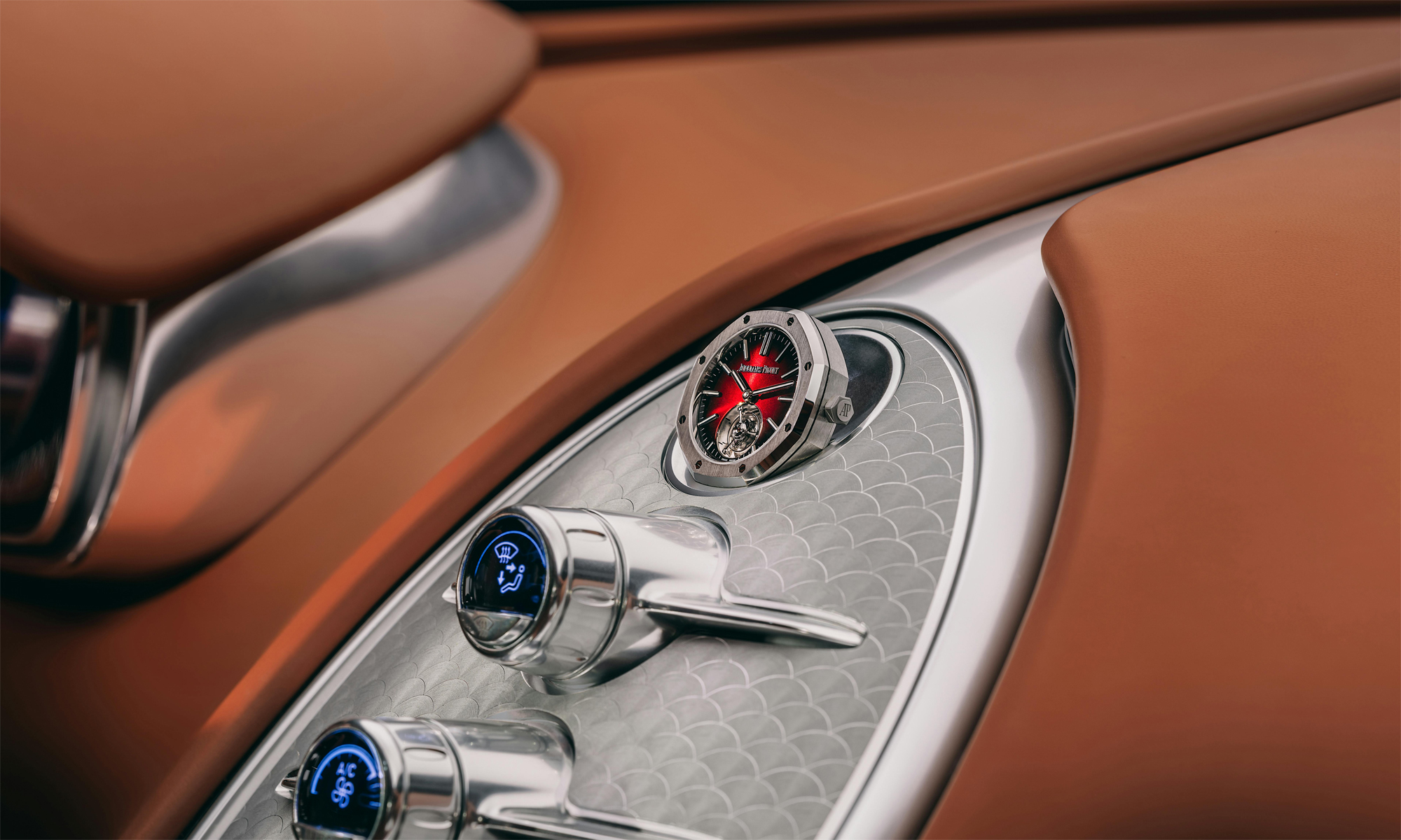 The center console is crafted from a single block of aluminum. At its peak, it features a 41 mm Audemars Piguet Royal Oak Tourbillon watch.