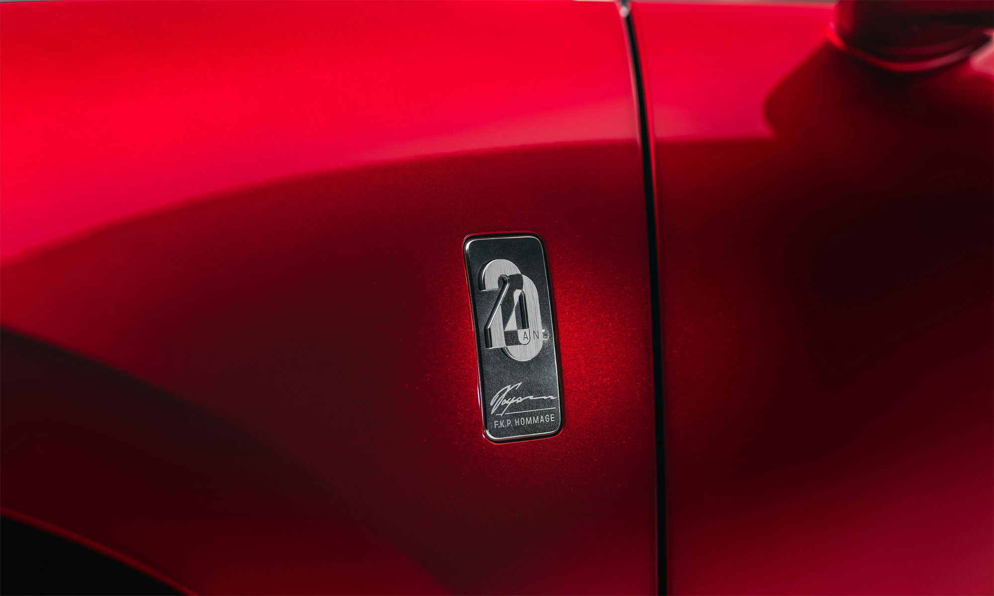 The FKP Hommage's exterior design retains the Veyron's silhouette but with modern refinements. Its 3D horseshoe grille, machined from a single block of aluminum, integrates seamlessly with the surrounding bodywork, departing from the original 2D design. The rear preserves the Veyron's rounded form and characteristic dual round taillights, with an enlarged central exhaust outlet for overall design harmony.
