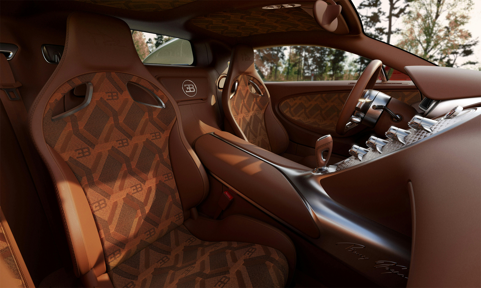 The cabin is enveloped in brown leather and fabric exclusively woven in Paris, marking Bugatti's latest advancement in interior personalization, a feature first introduced in the Tourbillon line.