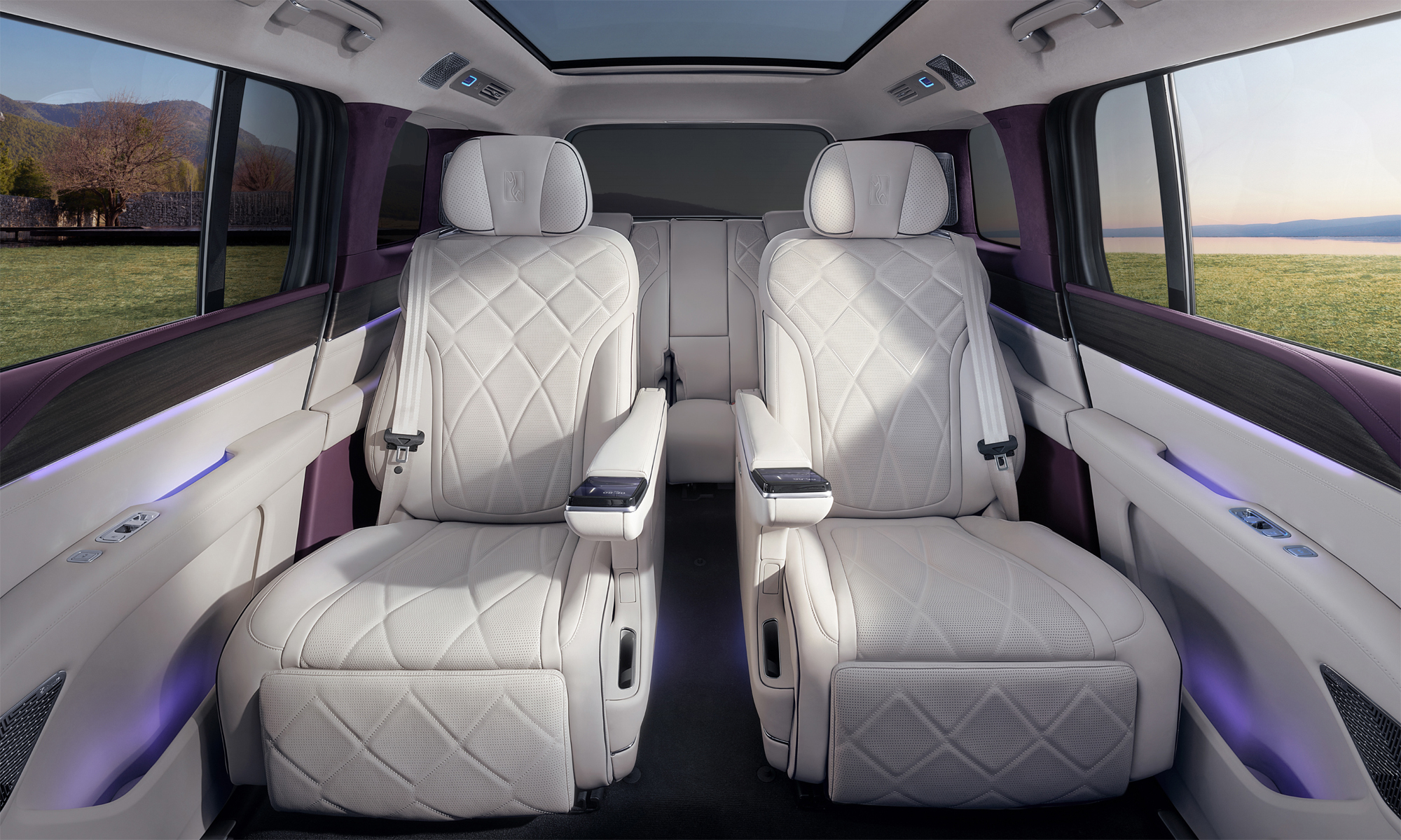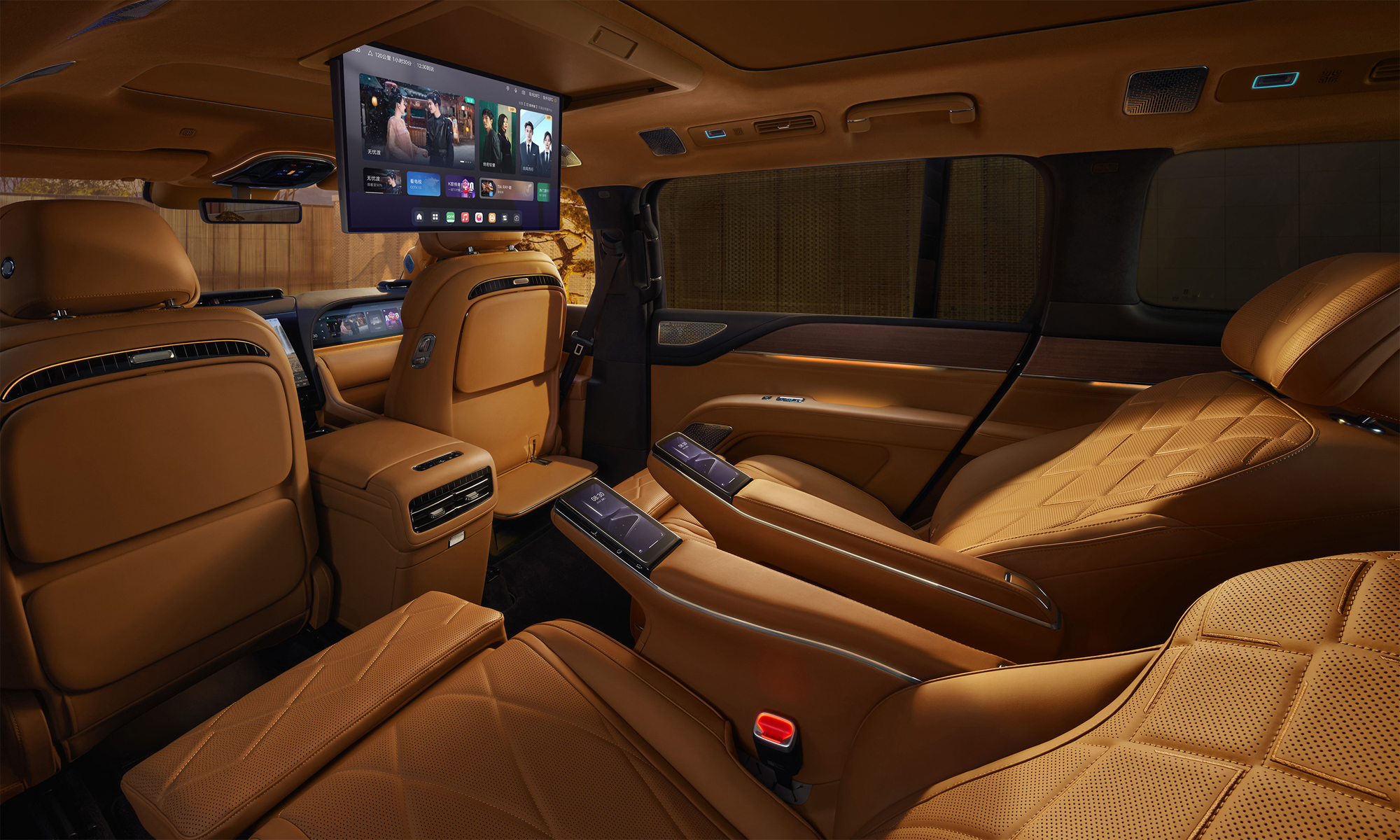 The second-row zero-gravity seats include headrest speakers, an 18-point massage function, smart screens in the armrests, leg rests, small tables, and wireless charging.