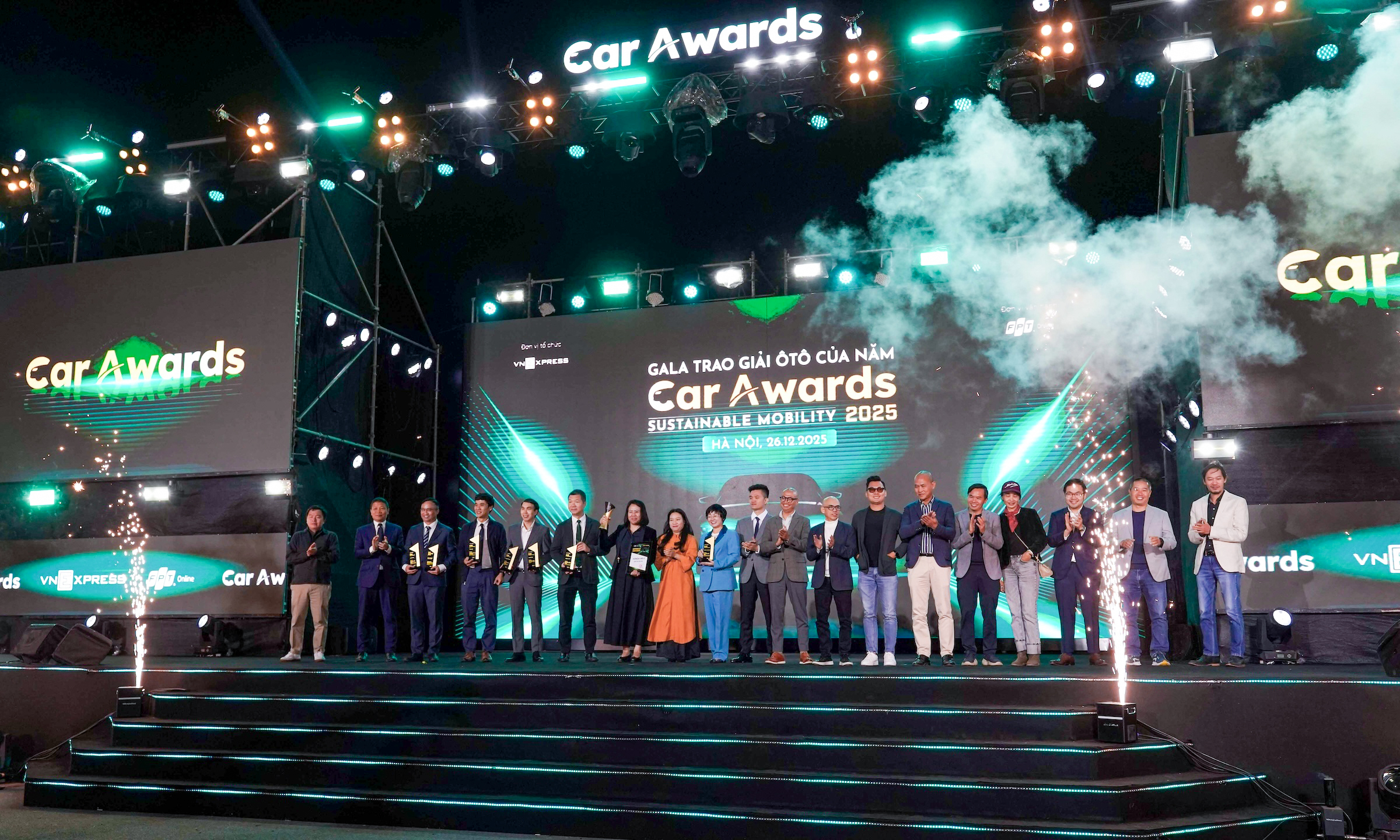 Representatives from various brands and the expert council stood together on the Car Awards 2025 stage. *Photo: Hoang Giang*