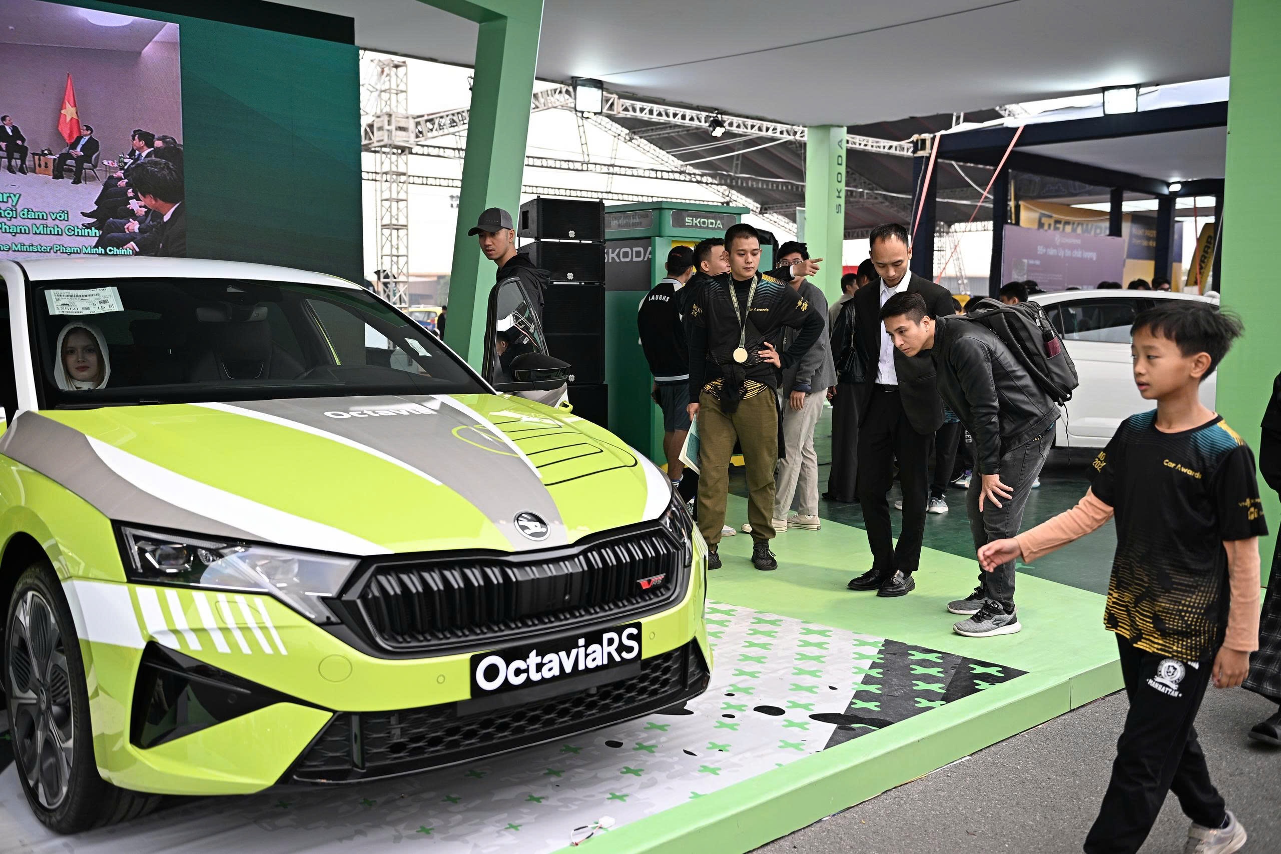 In the car display areas, visitors explored throughout the three-day exhibition, from 26-28/12. The latest and best-selling car models were brought by brands to VnMS 2025. Pictured is a group of visitors learning about Skoda's high-performance Octavia RS sedan. *Photo: Minh Quan*