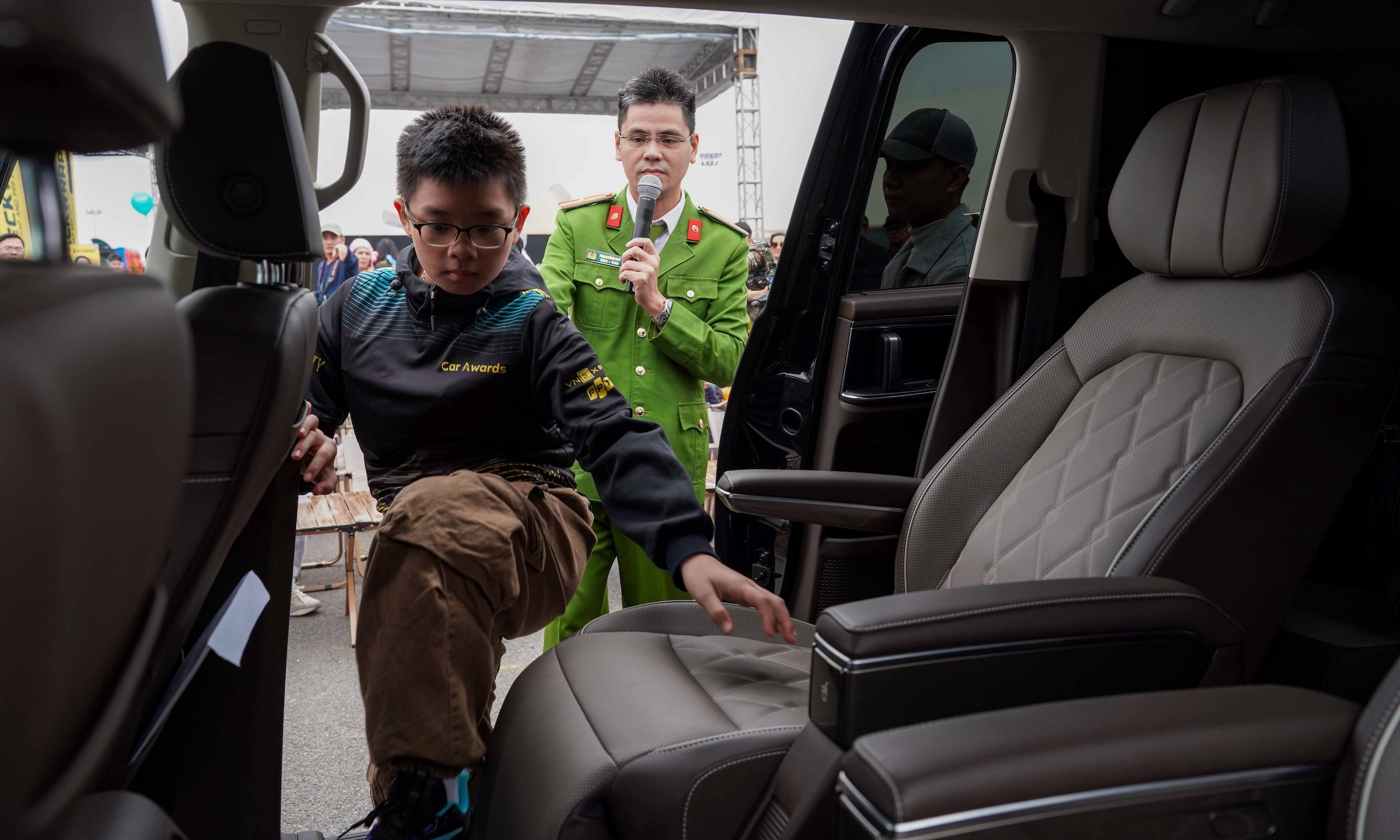 VnMS 2025 also featured a special program: "Escape and Rescue from Vehicles" for children. Major Pham Dang Quy, an officer from Fire Prevention, Fighting and Rescue Police Team Area 20, Hanoi Police, was responsible for explaining and instructing children on skills to signal for help and escape from a car if they are unfortunately left behind.