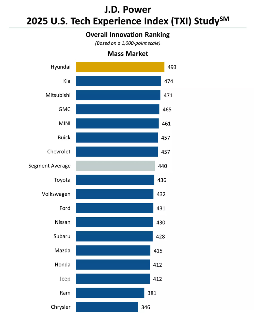 2025 Tech Experience Index Study ranking with Hyundai leading the mass-market segment. Photo: J.D. Power |