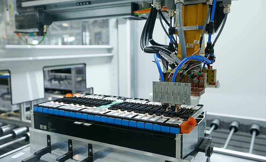 Electric vehicle battery packs are assembled by robots. BMW AG