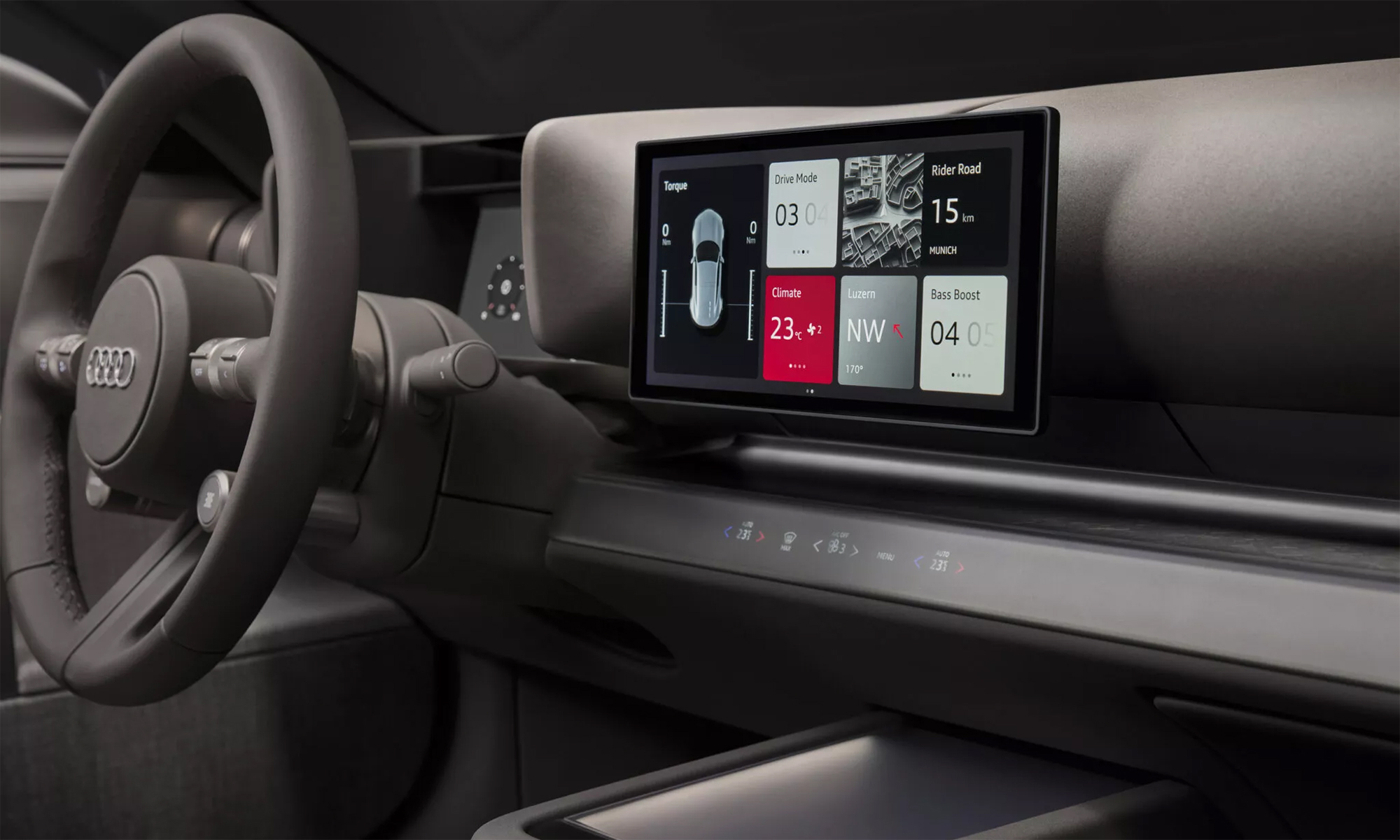The interior of the Concept C features a minimalist style that Audi describes as "shy tech." It has a 10.4-inch touchscreen infotainment system that can be folded into the dashboard. The control buttons are made of aluminum. The logo on the steering wheel is crafted from metal. There's a digital instrument cluster behind the steering wheel, and the climate control system is digitally controlled. Audi has abandoned leather in favor of fabric upholstery.