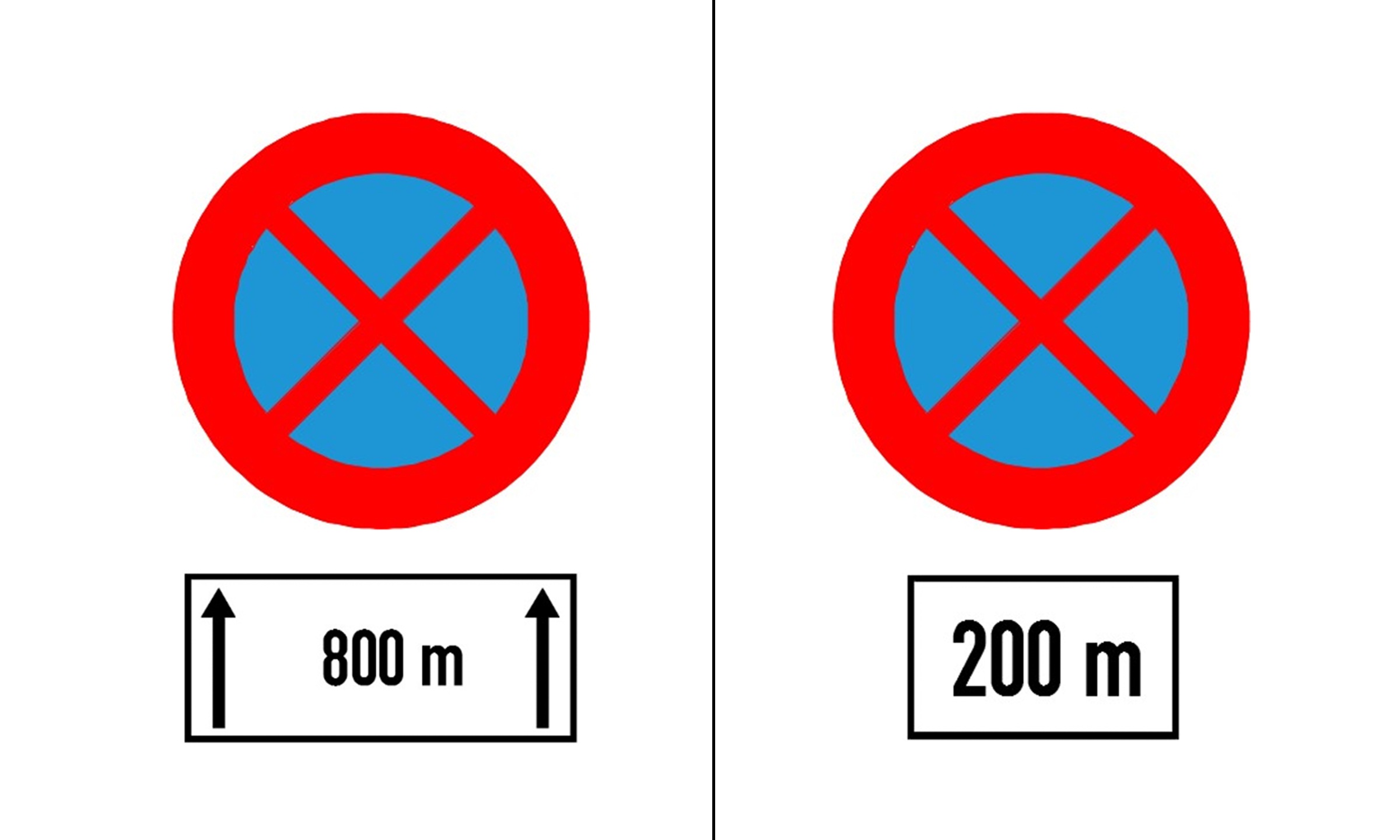 Conversely, Sign S.502, titled "distance to the sign's object", informs drivers about the distance to a specific traffic condition or restriction ahead. This sign is placed below hazard, prohibition, mandatory, and informational signs when their placement deviates from general regulations. It communicates the actual distance from the sign's location to the object being signaled. The number on the sign is also recorded in meters, rounded to the nearest ten. Therefore, a "200 m" supplementary sign S.502 indicates that the prohibited stopping and parking section will begin 200 m further down the road.