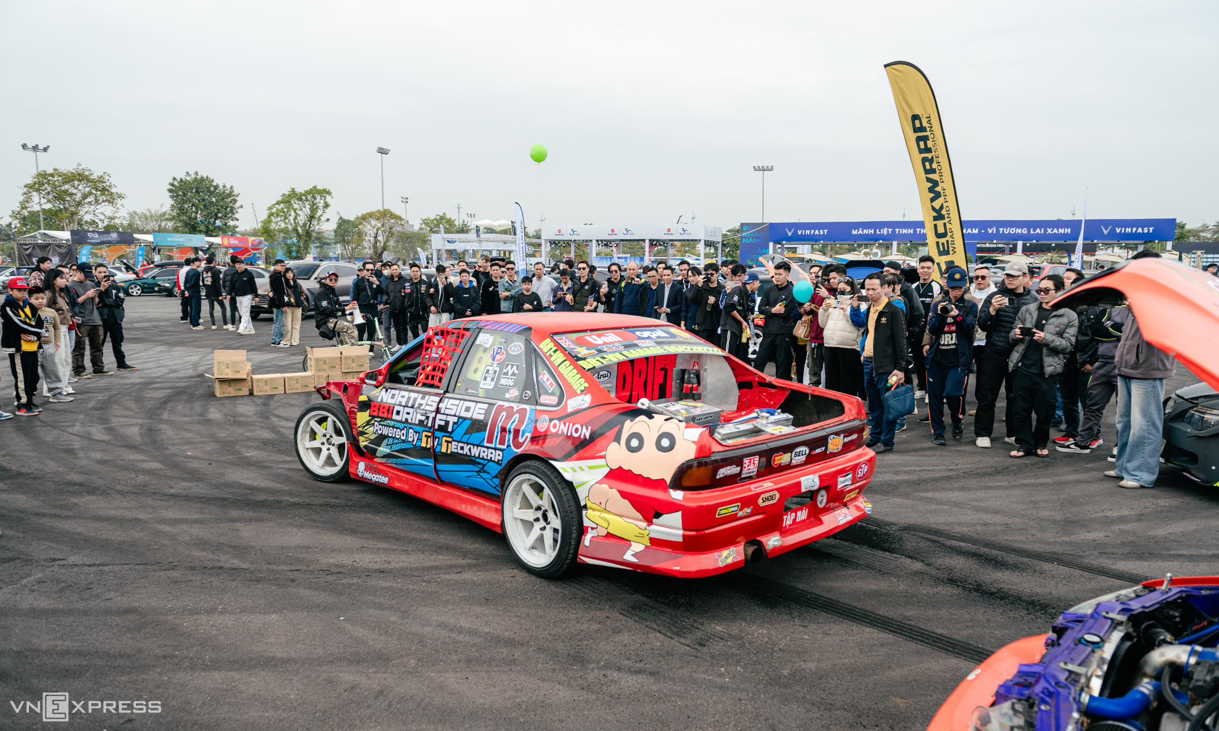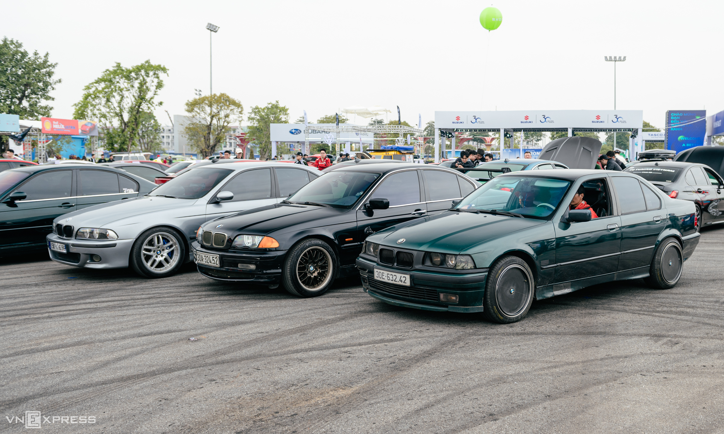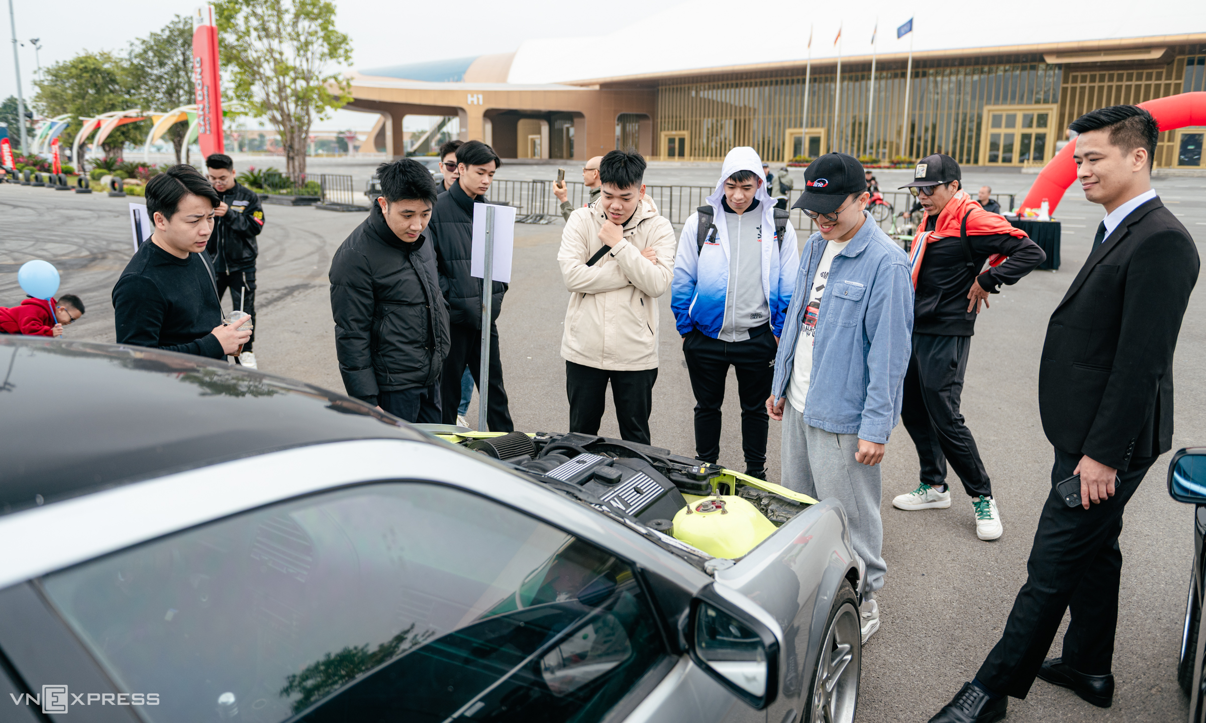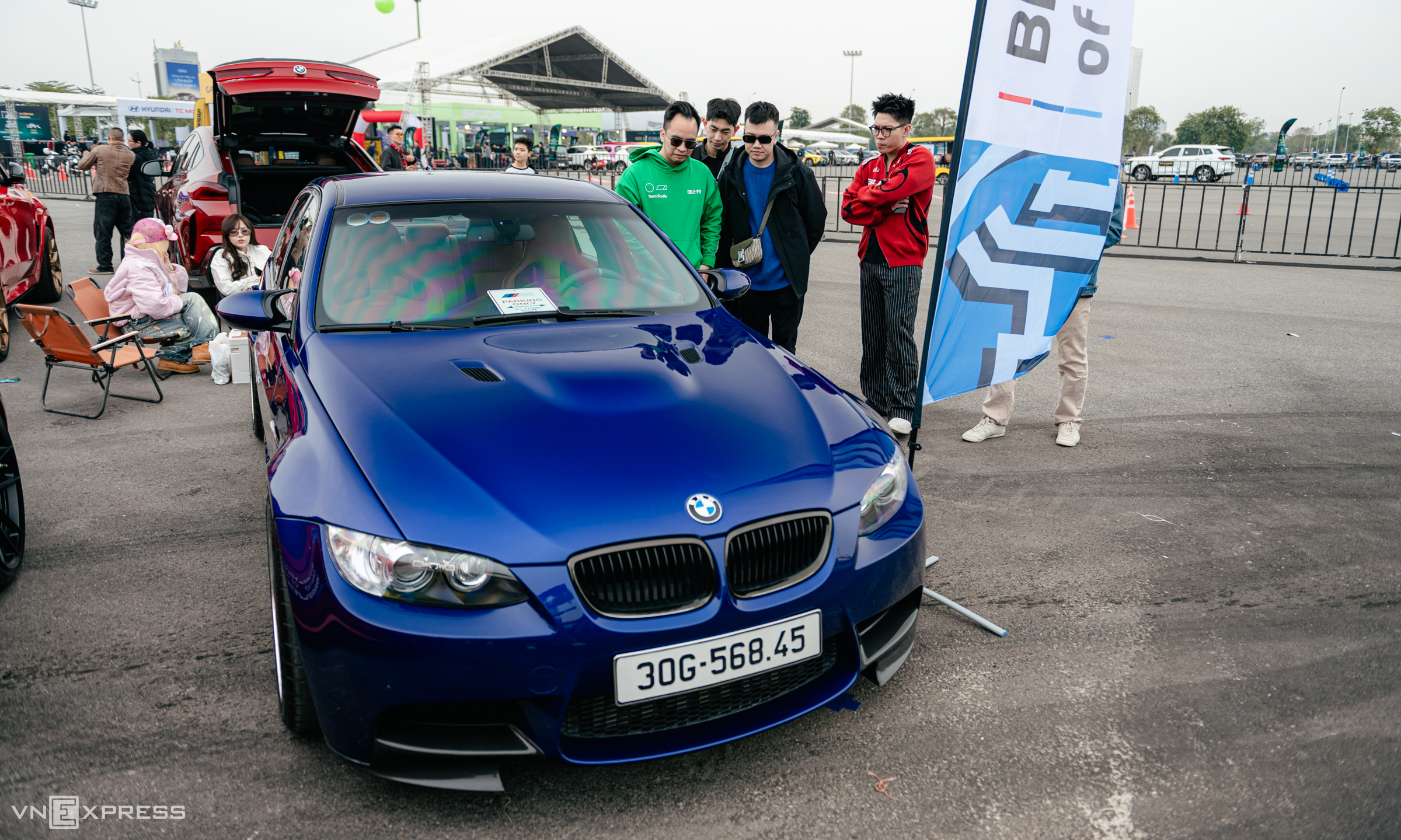 Nguyen Canh Duy (in a blue shirt and cap) participated in the event with his BMW series 3, E36 code. Duy's car had its hood removed, exposing the engine bay and drawing all eyes from exhibition visitors. Duy shared, "My car's entire chassis has been modified for drifting and to handle more power than the original engine. Additionally, I painted the exterior gray and the frame neon to enhance the car's visibility".