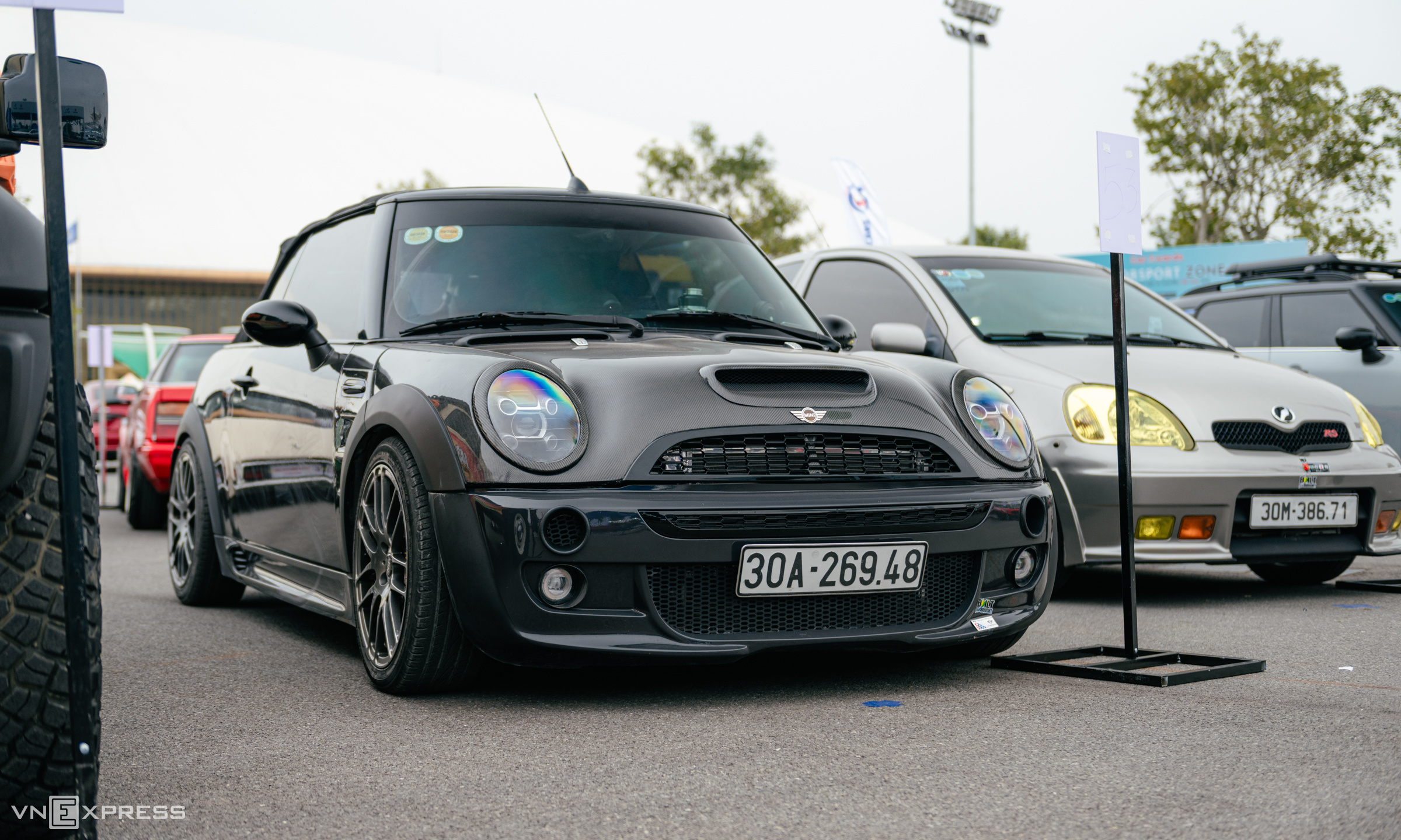 A 2005 Mini, customized in the John Cooper Work style, featured numerous carbon details and a lowered suspension. At the event, the owner also brought a Toyota Vitz RS (next to it) and other models like Vietnam's one Subaru Dex and a Nissan Bolero. |