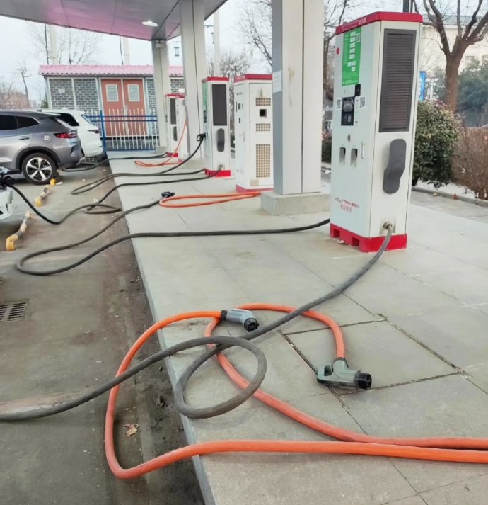 Some charging cables, instead of being plugged into the charging station, lie on the ground at an electric vehicle charging station in China. *Weibo* |