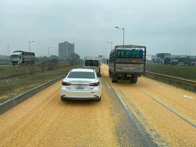 On the morning of 29/12/2025, on the Ha Noi - Thai Nguyen highway in the Yen Binh area of Thai Nguyen, a truck carrying corn spilled tons of kernels onto the road. This caused many cars behind to become disoriented for dozens of seconds. The layer of corn covered the entire lane, accompanied by dust and flying kernels, turning the dry road into a slippery surface.