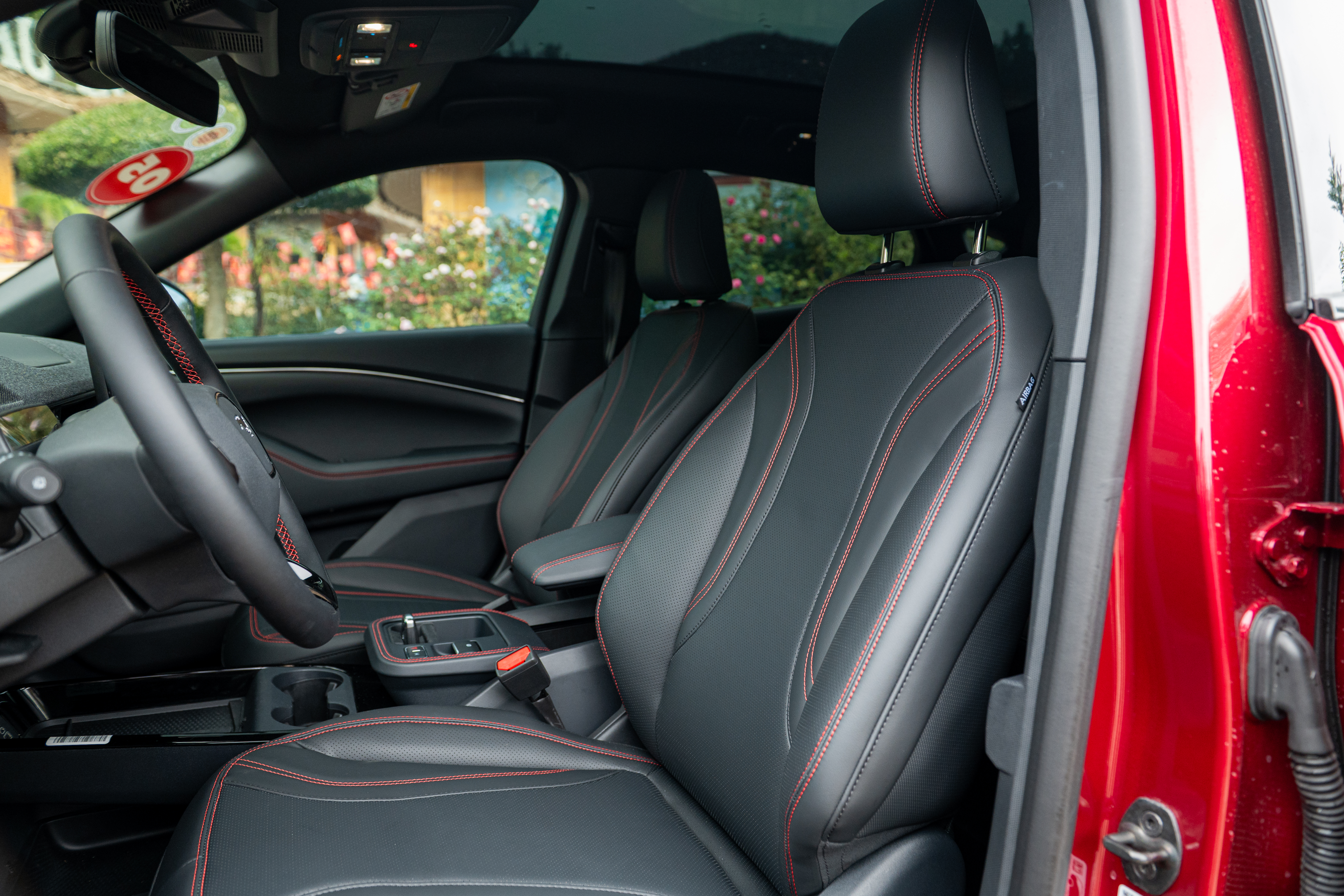 Leather-upholstered seats with red contrast stitching. Photo: Minh Quan