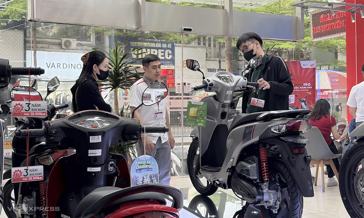 Customers browse for gasoline motorcycles at a Honda store on Nguyen Luong Bang street, Ha Noi, on 13/3. *Luong Dung*. |