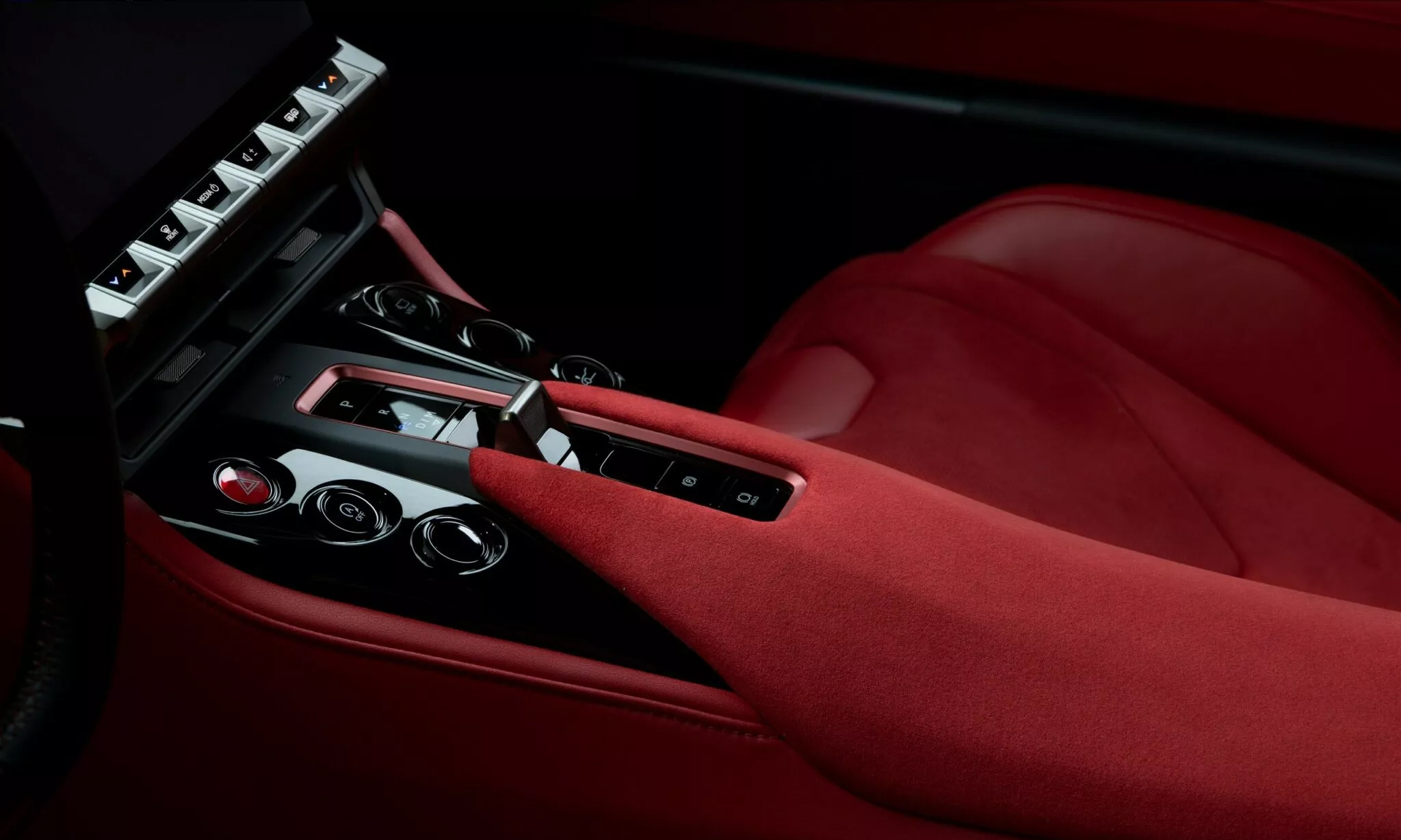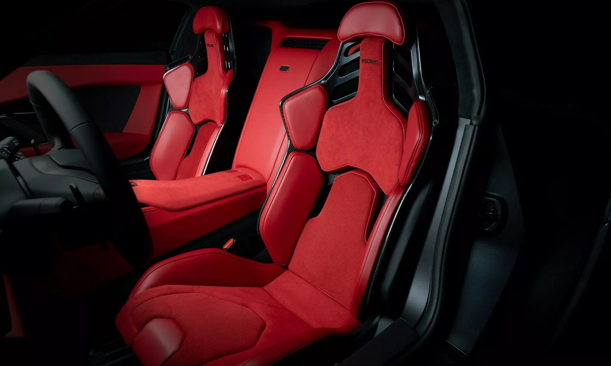 It features a dominant red and black color scheme, with carbon-frame seats upholstered in leather and Alcantara.