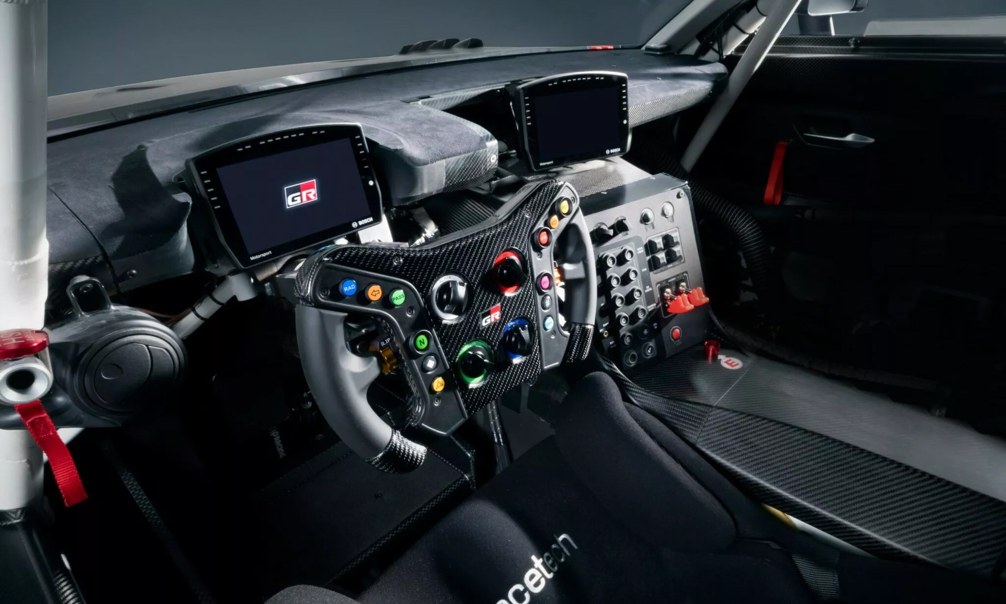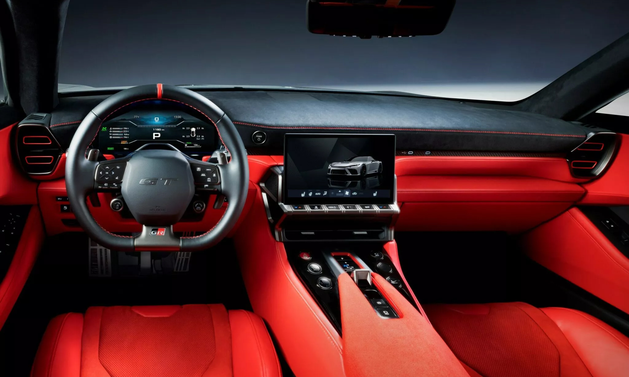 The interior compartment differs significantly from other Toyota sports cars, featuring a dominant red and black color scheme and carbon-frame seats upholstered in leather and Alcantara. A digital instrument cluster behind the steering wheel offers a unique interface, complemented by a new GR steering wheel with paddle shifters and a large central infotainment screen. The driver's position prioritizes track-focused ergonomics, including excellent external visibility and controls placed close to the driver. Consequently, the car retains physical buttons for quick access to driver assistance features around the gear selector.