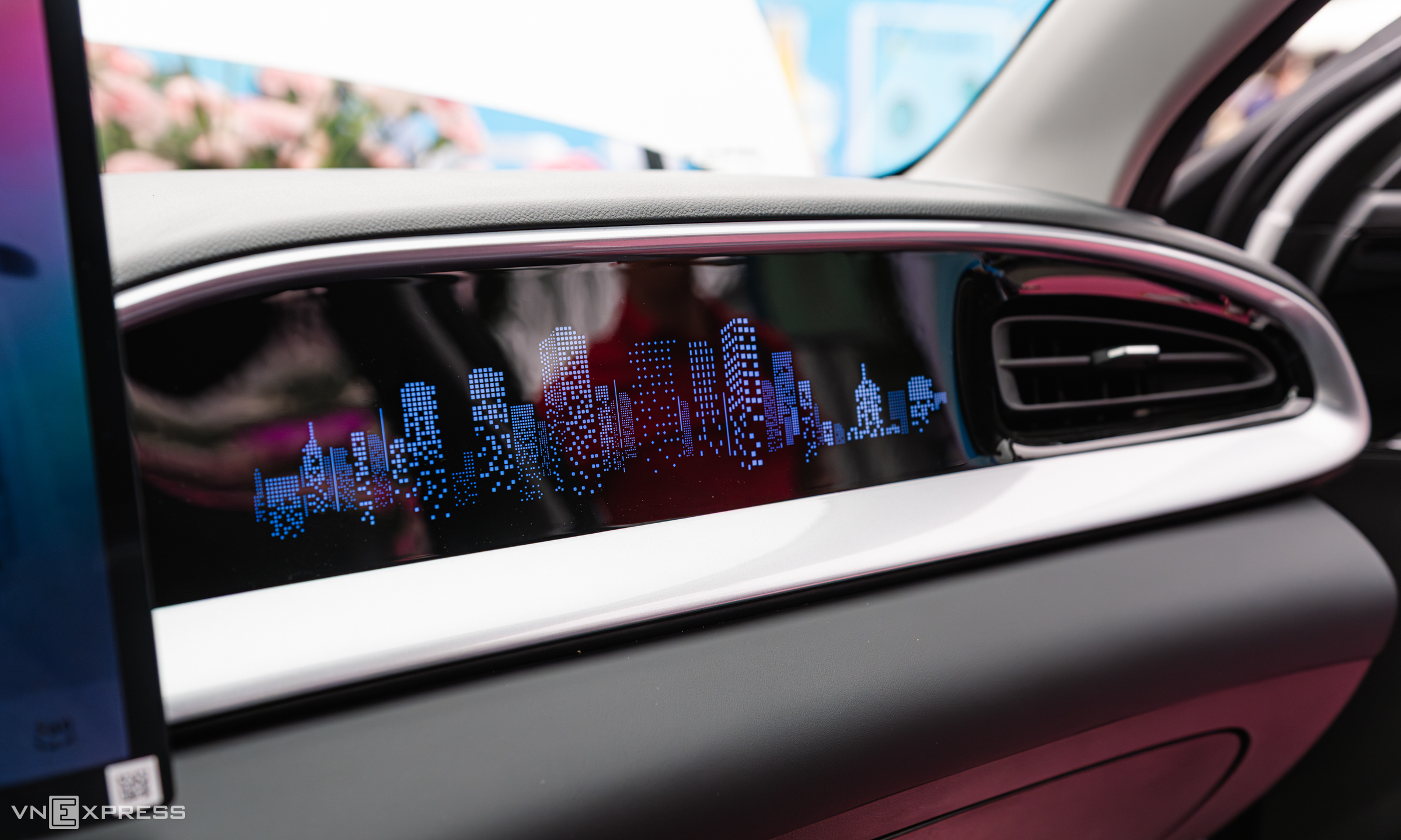 The passenger dashboard and door panels are adorned with city-themed patterns, underscoring the EX2's urban focus. These patterns also depict the Hangzhou, China, skyline, where Geely's headquarters are located.