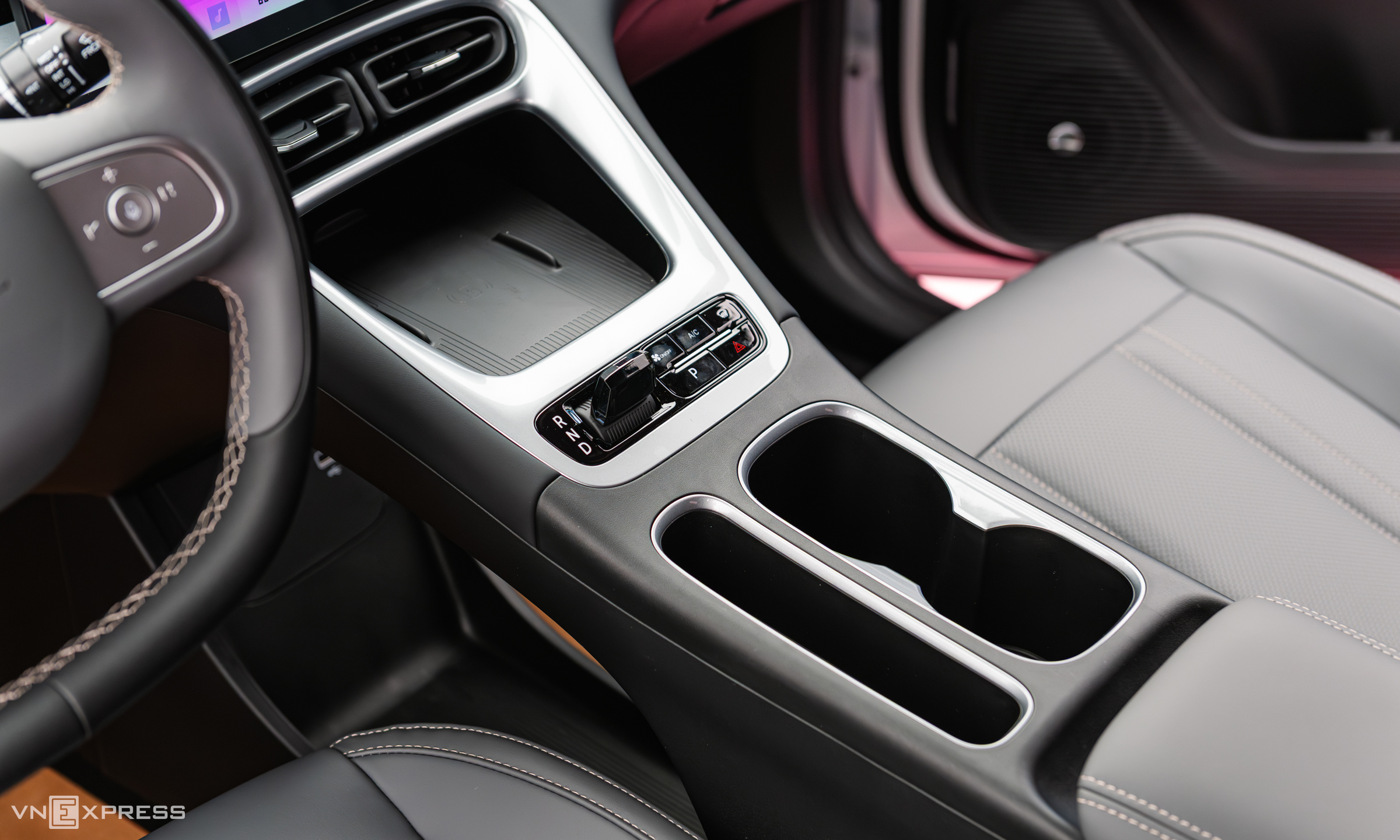 The minimalist central control cluster features a crystal-like gear selector. Adjacent to it are quick-access buttons for climate control, the front defroster, and hazard lights. The open design below increases storage space and includes two USB charging ports. The Max version also offers wireless charging.