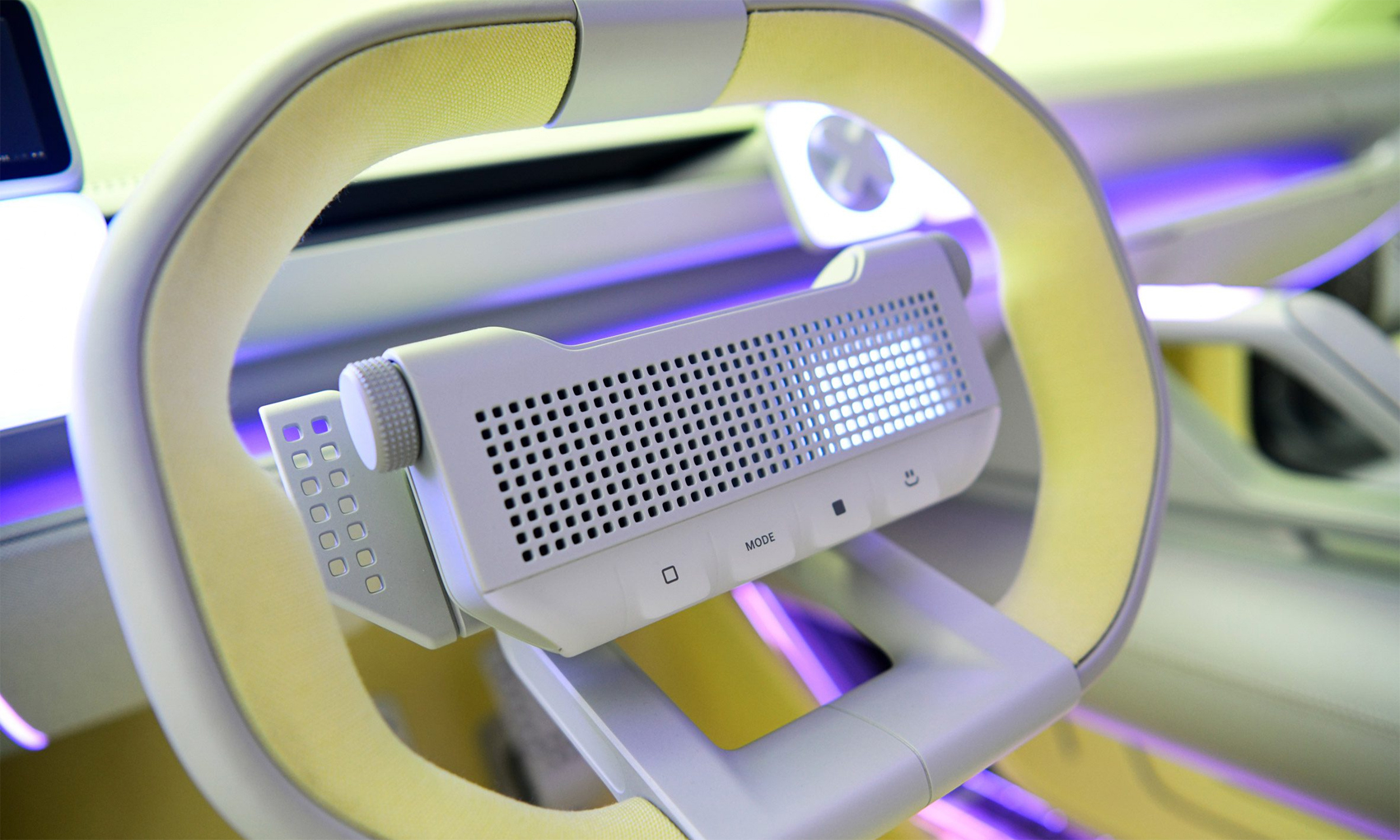 Instead of a traditional instrument cluster and infotainment screen, several square screens and control surfaces are mounted in front of the steering wheel.