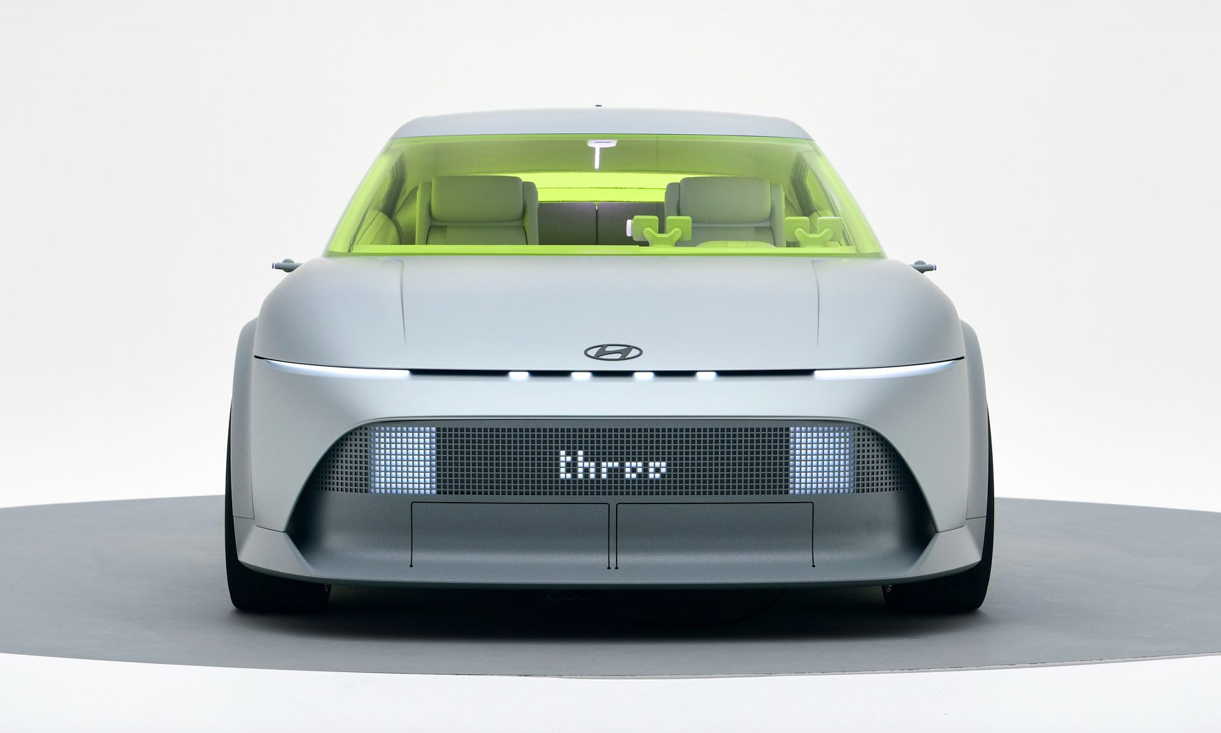 Hyundai calls the Three an "Aero Hatch," citing the combination of its sporty roof, the visual appeal of intersecting lines created by the "Parametric Dynamics" design language, and the upright rear window as a blend of performance and practicality.