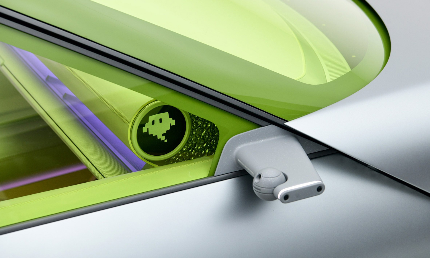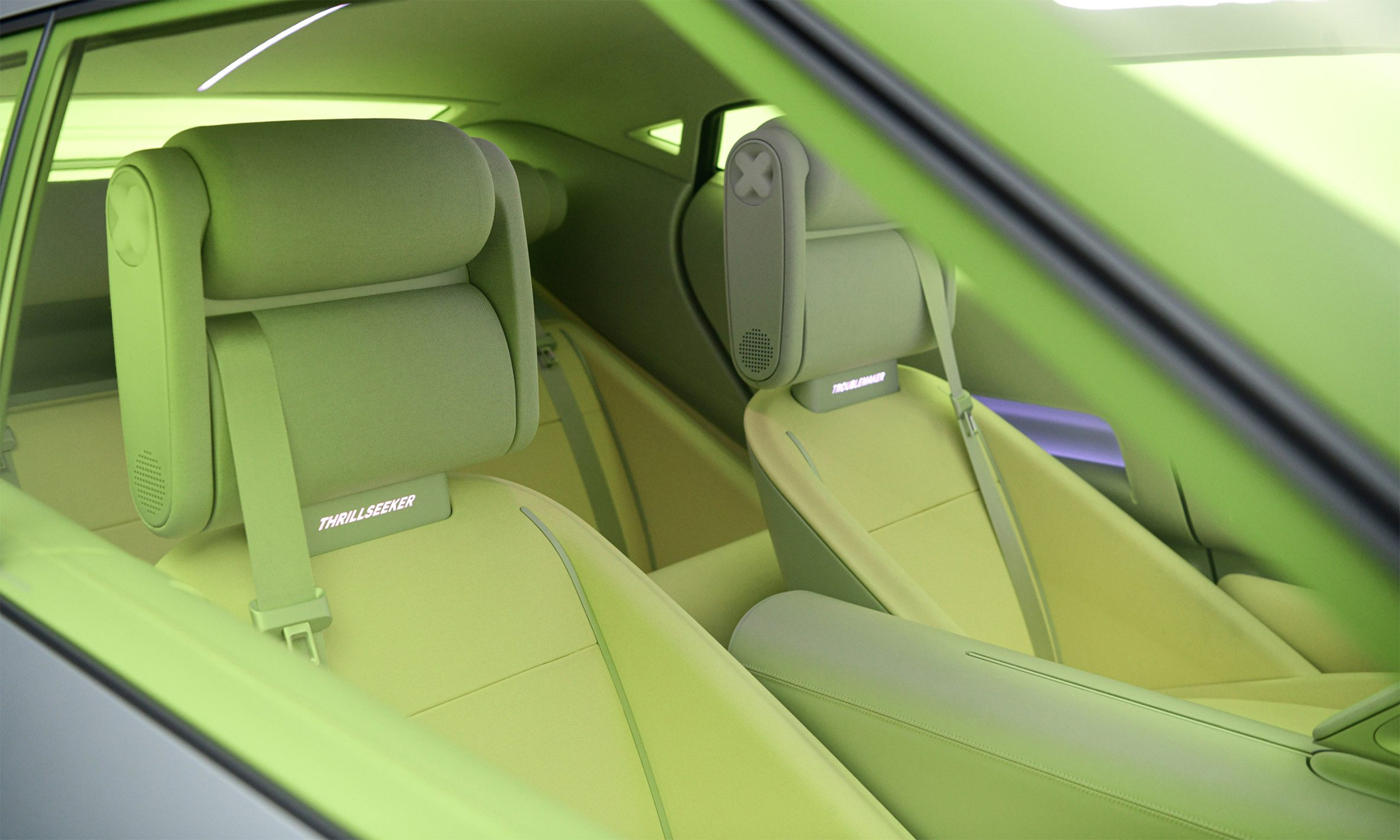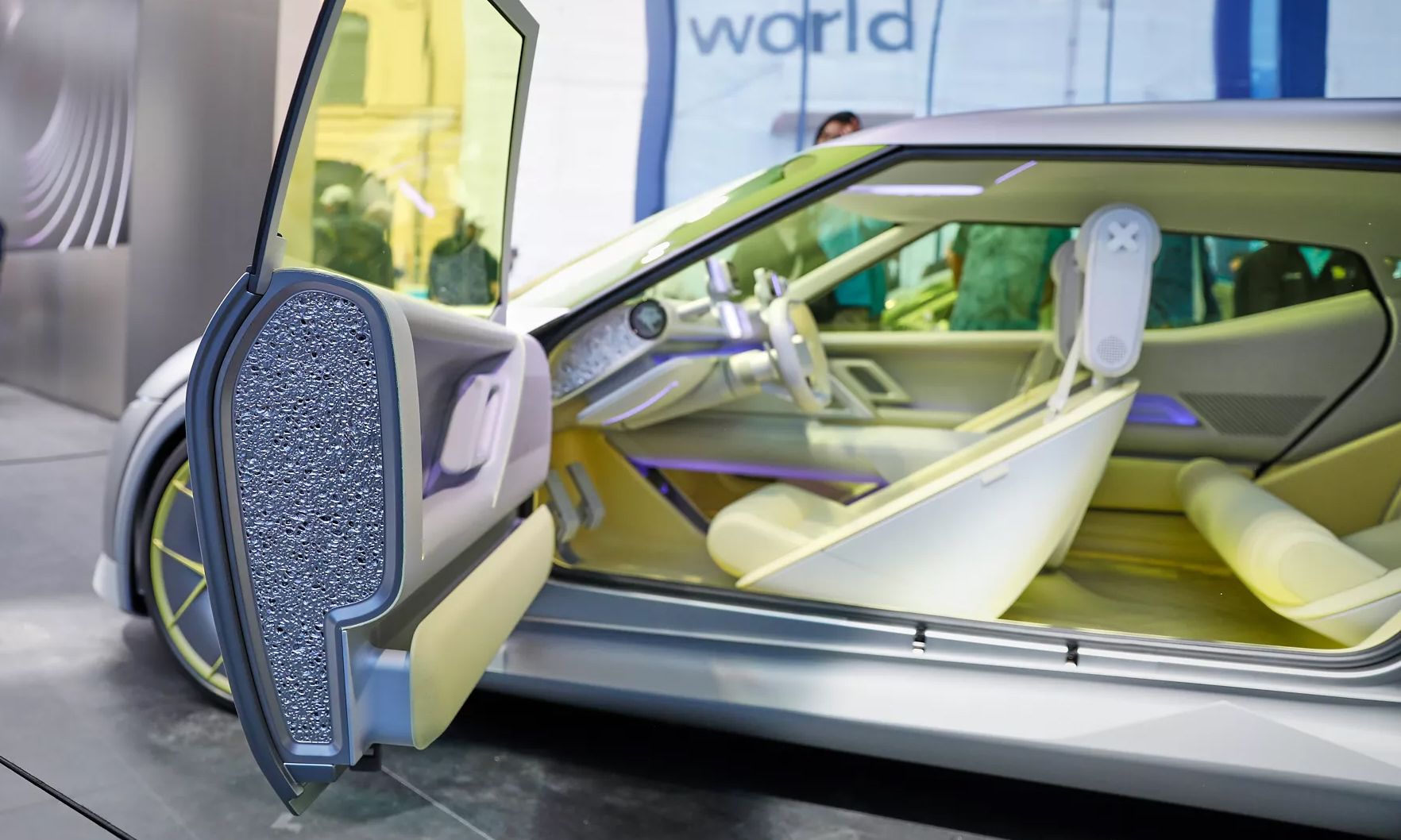The car uses sustainable materials, including recycled fabrics from ocean waste and lightweight aluminum foam throughout the cabin.