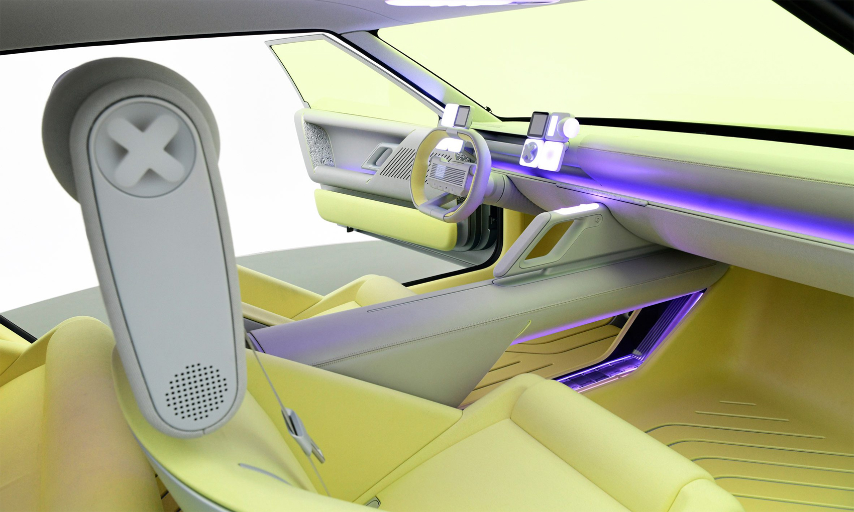 The Concept Three marks a clear departure from Hyundai's traditional design themes. There's no large touchscreen; instead, the driver brings their own devices to attach to the dashboard and customize the experience. Form-fitting seats are upholstered in sustainable fabric, and unique handles on the dashboard give the impression of an integrated vacuum system. The lemon yellow and light gray surfaces utilize sustainable materials like recycled fabrics from ocean waste and lightweight aluminum foam throughout the cabin.