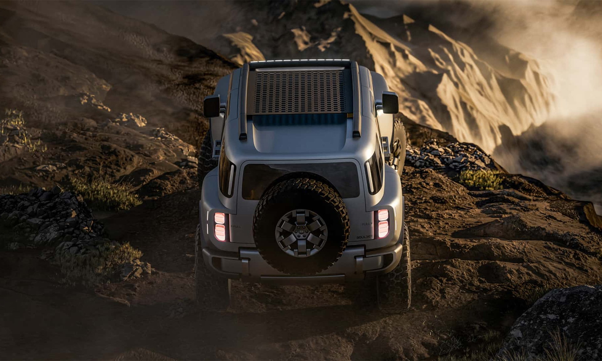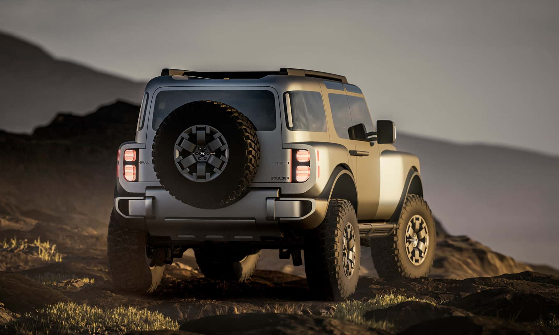According to Hyundai, the Boulder Concept's angular design provides the SUV with impressive approach, departure, and breakover angles, alongside deep water wading capability. It features 37-inch off-road tires and a spare tire mounted on its rear door. The rear door boasts dual hinges, allowing it to open in both directions, and the rear window is electrically adjustable.