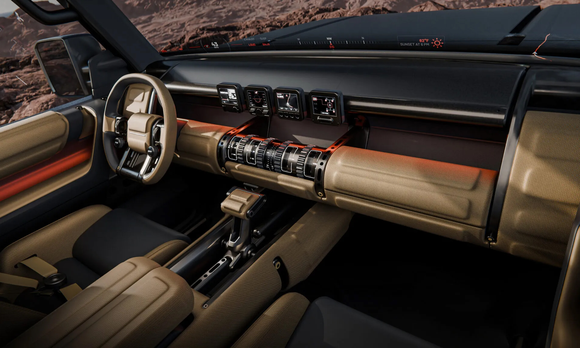 The Boulder's interior design embraces a retro-futuristic aesthetic. It eschews a traditional instrument cluster screen; instead, vital vehicle information projects onto the base of the windshield, akin to a full-width head-up display. The rounded dashboard features four small square screens with physical controls, a departure from the common single large screen, a design choice many enthusiasts hope represents the future of in-car displays.