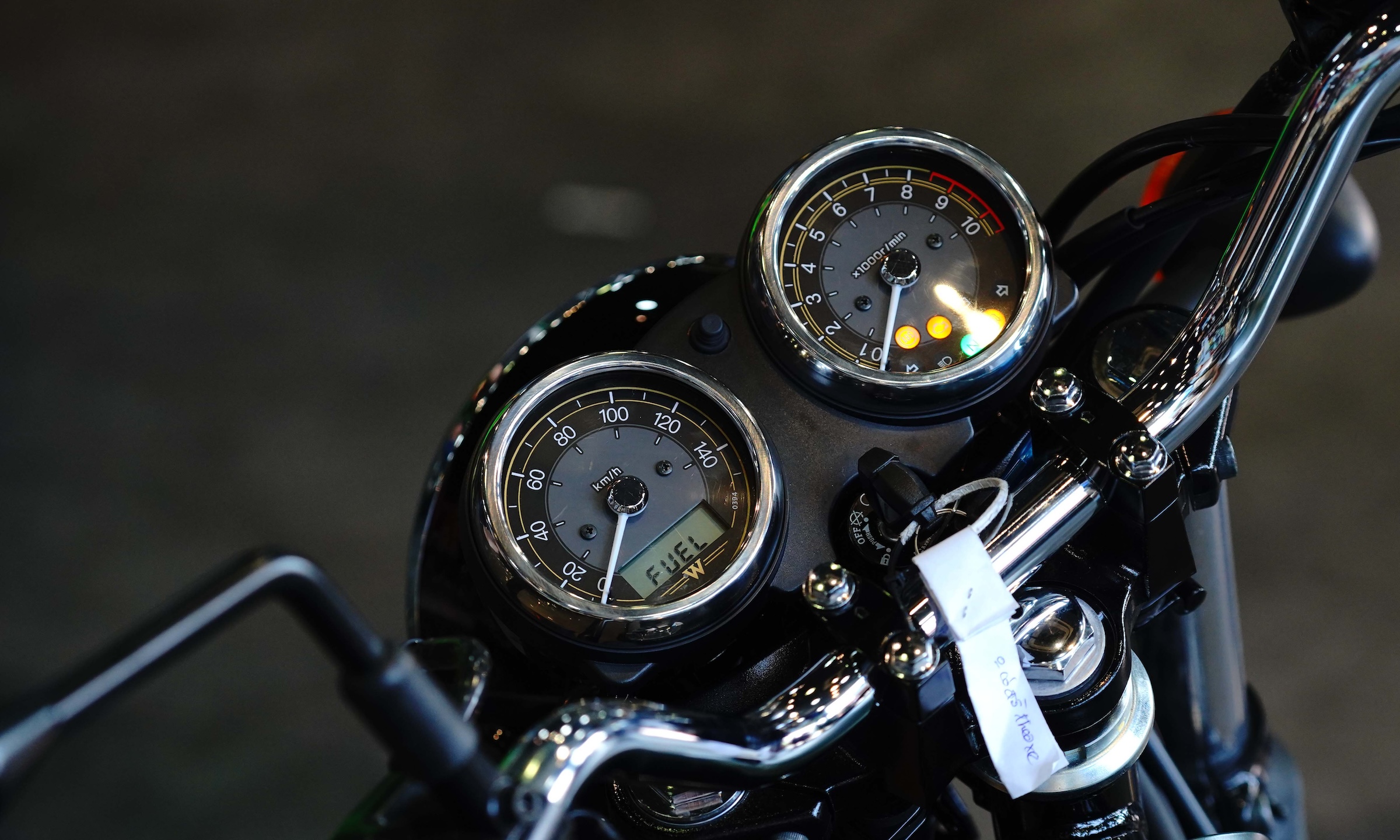The W230 features two gauges in front of the handlebars: one displays speed and fuel level, while the other shows rpm, gear position, and engine warnings.