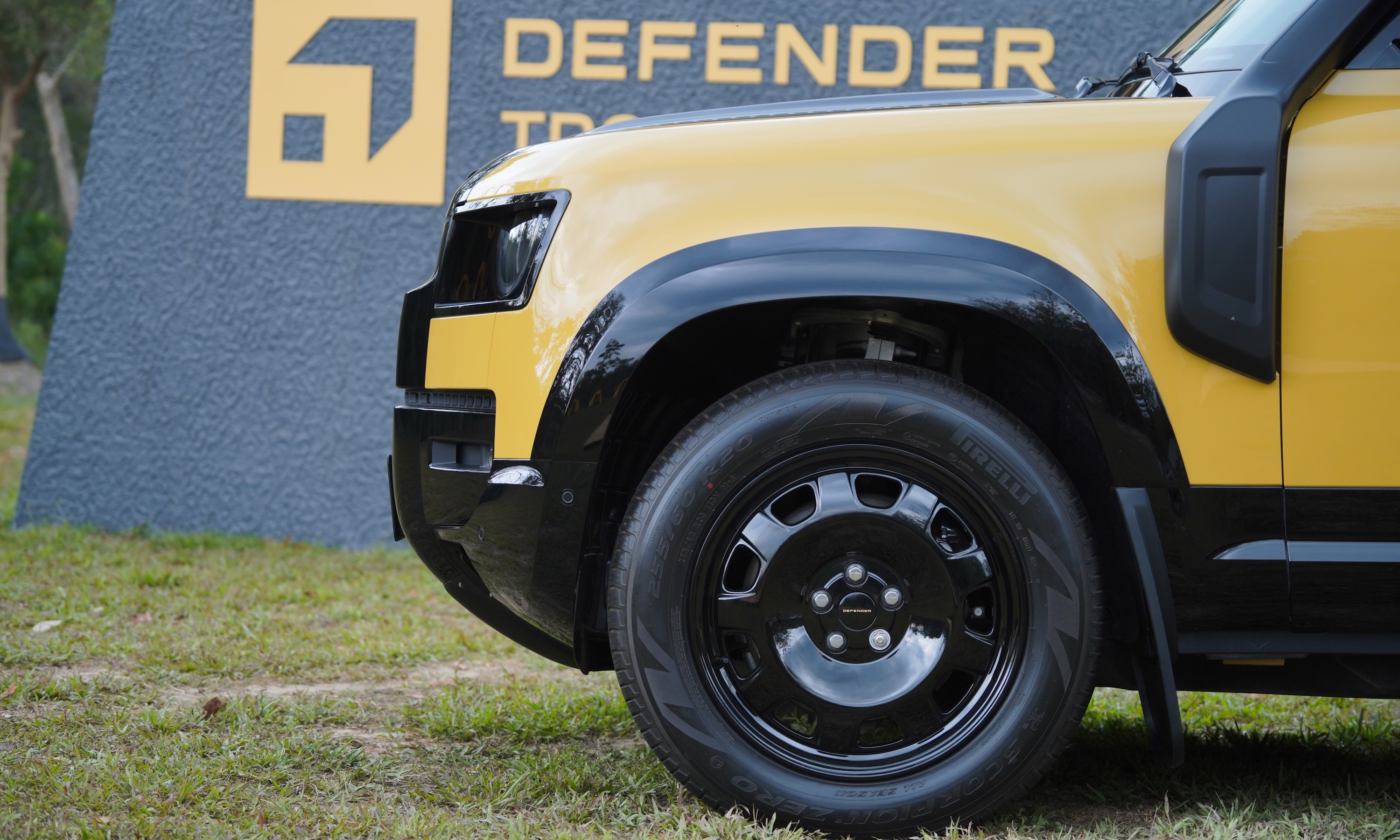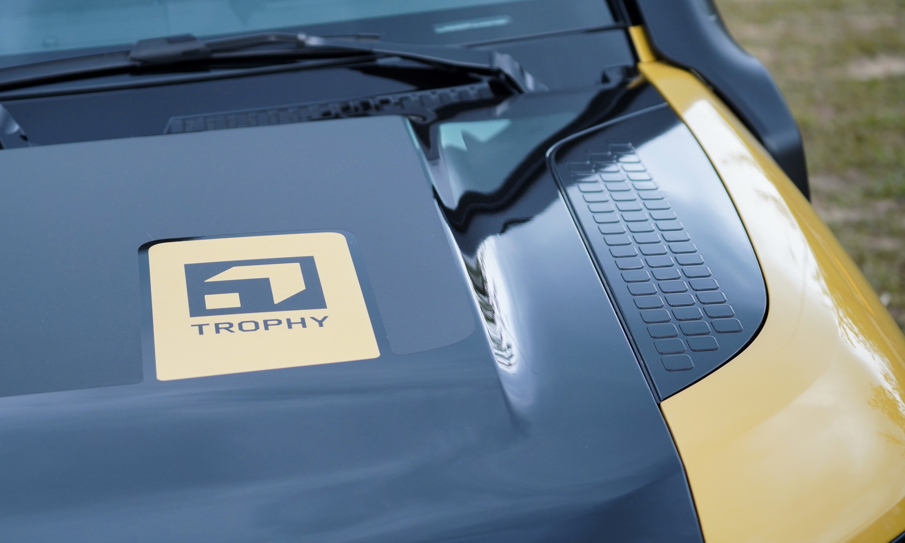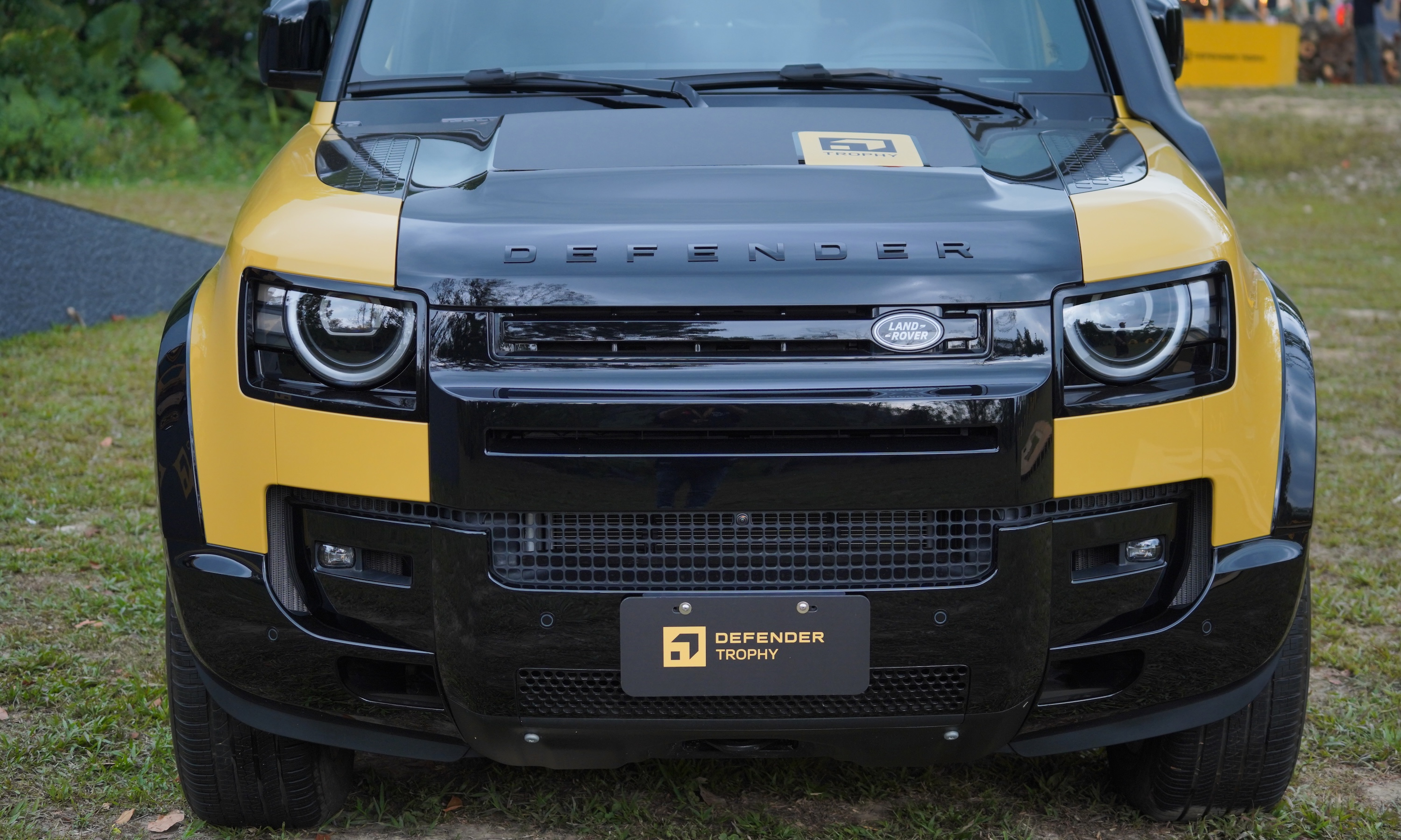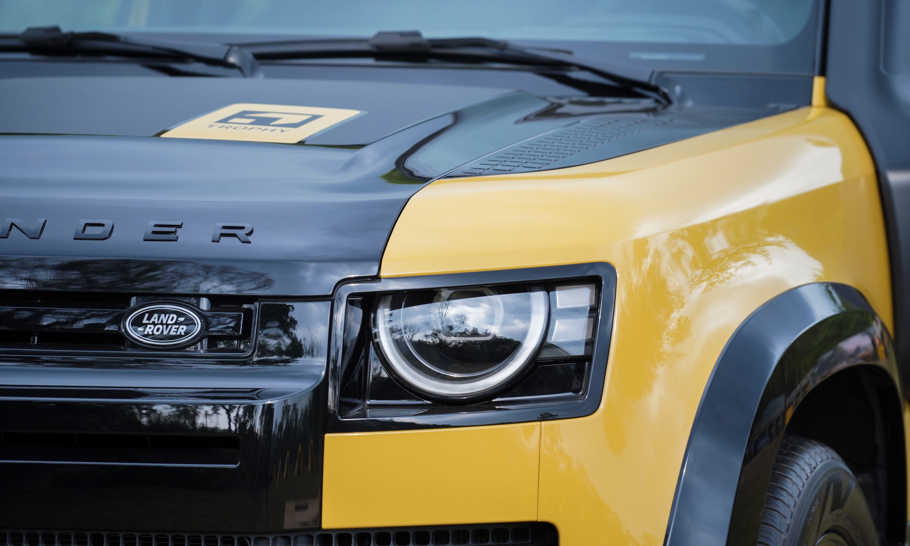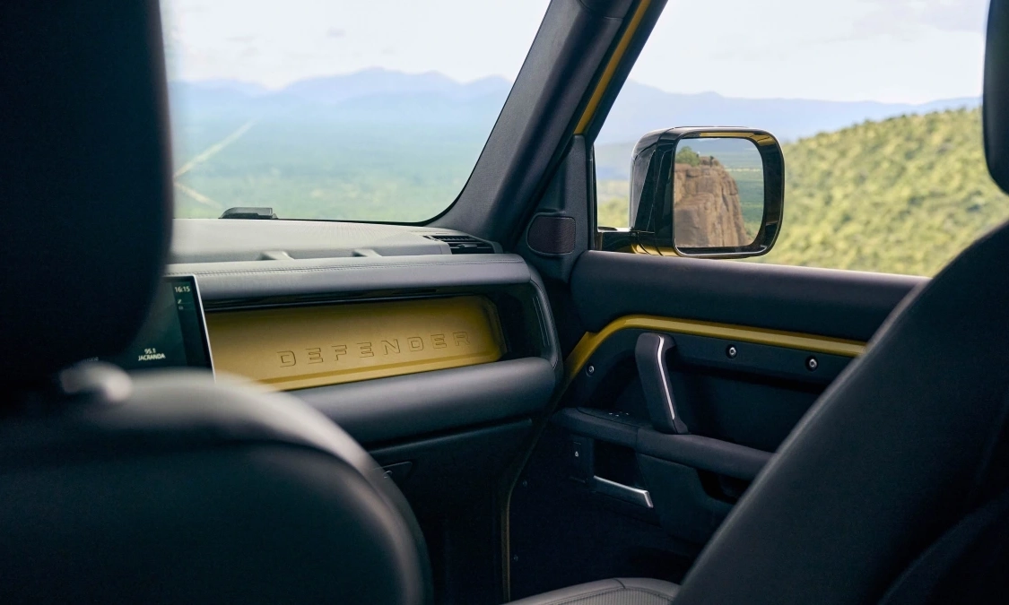 Defender Trophy competition badges are prominently displayed on the hood, C-pillar, door sills, and dashboard. The interior largely mirrors the standard version, with the exception of yellow accents running across the dashboard and doors, creating a distinctive highlight.