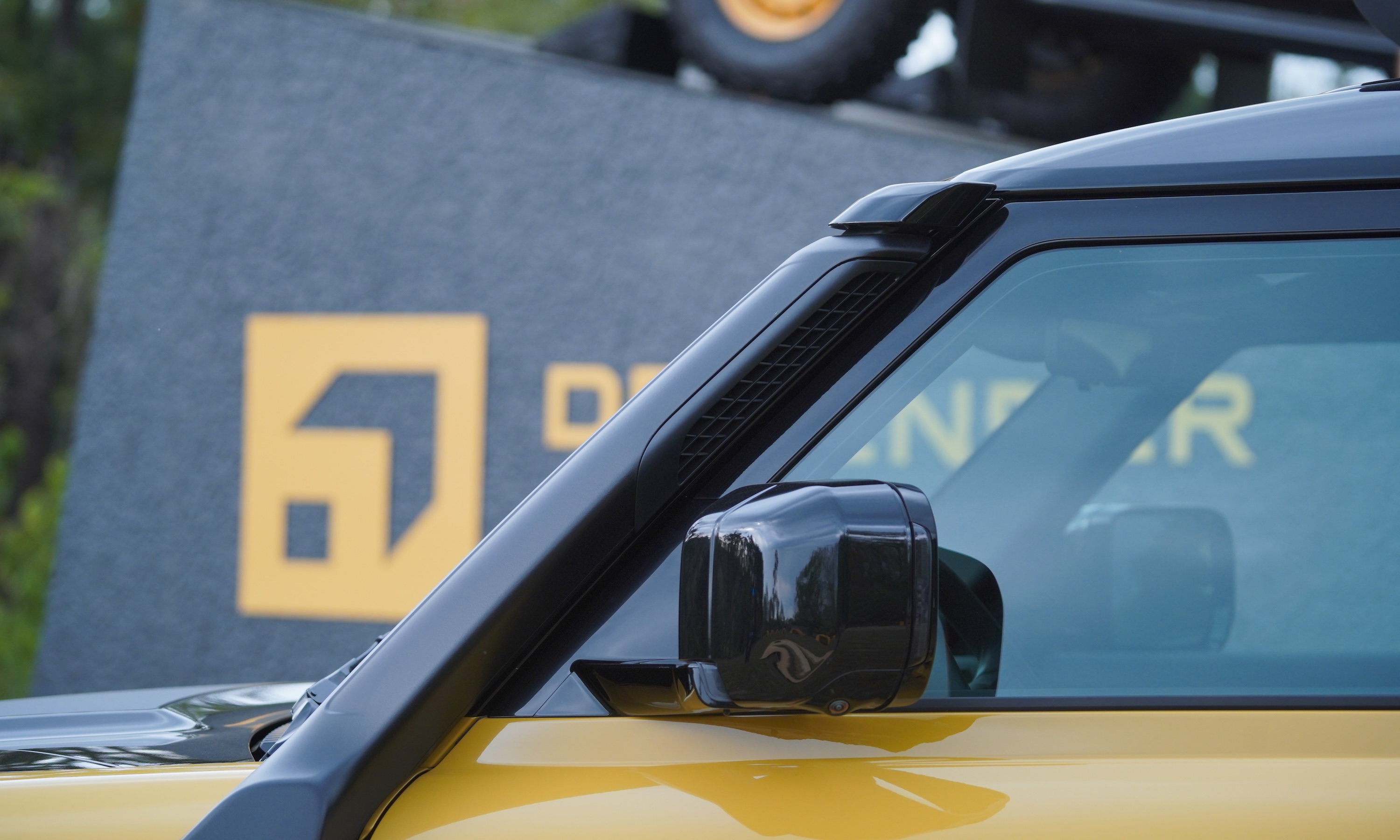 Contrasting with the yellow and green exterior colors is a glossy black paint finish on the hood, lower body, brake calipers, and rear recovery hooks. The vehicle is equipped with 20-inch Goodyear Wrangler All-Terrain Adventure multi-terrain tires.