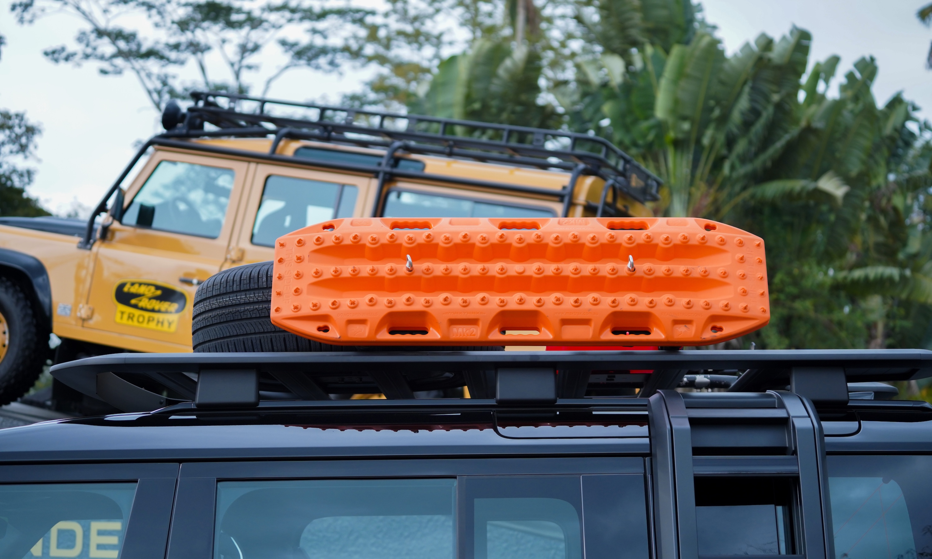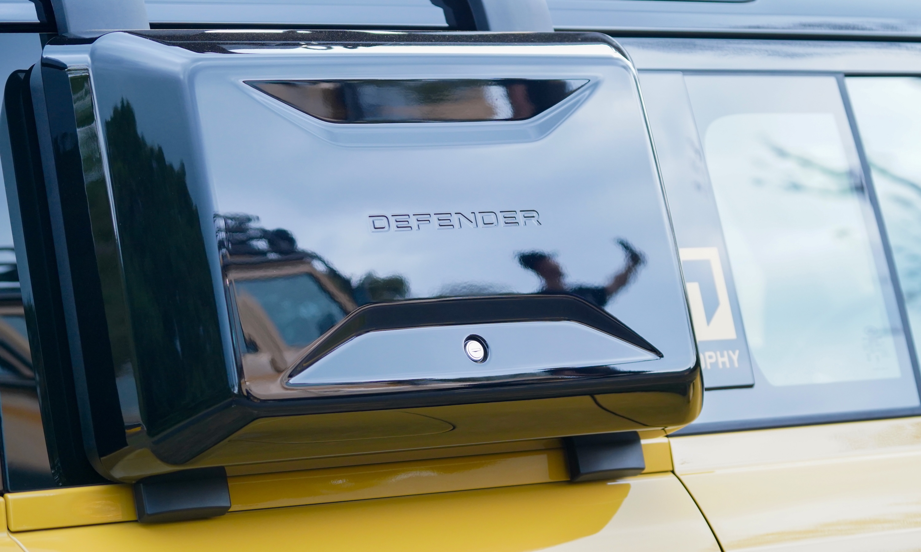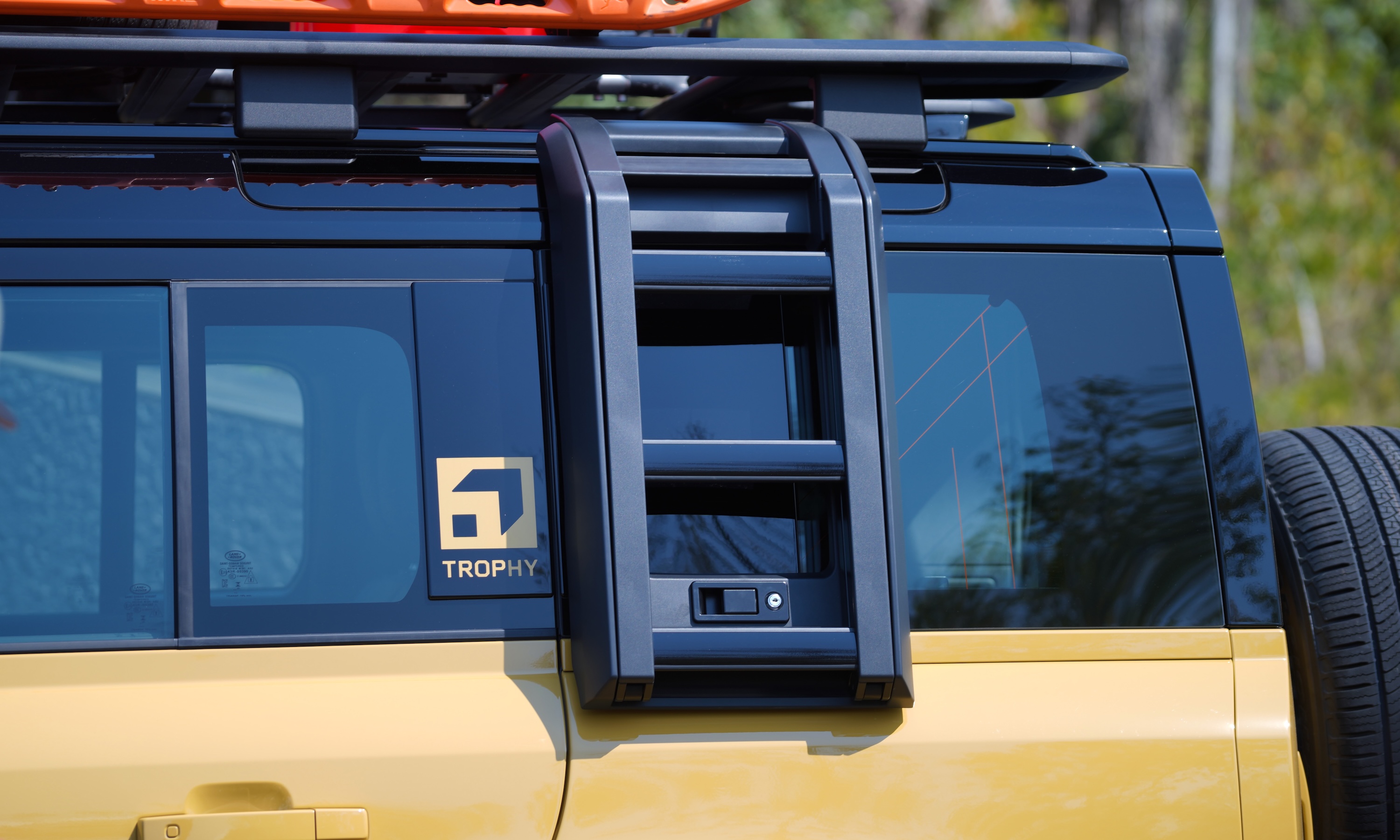 In addition to the standard features, the Defender Trophy includes exclusive accessories such as a roof rack, front and rear mudguards, and a raised air intake on the A-pillar. It also comes with a matte black folding side ladder and a waterproof storage box on the C-pillar.