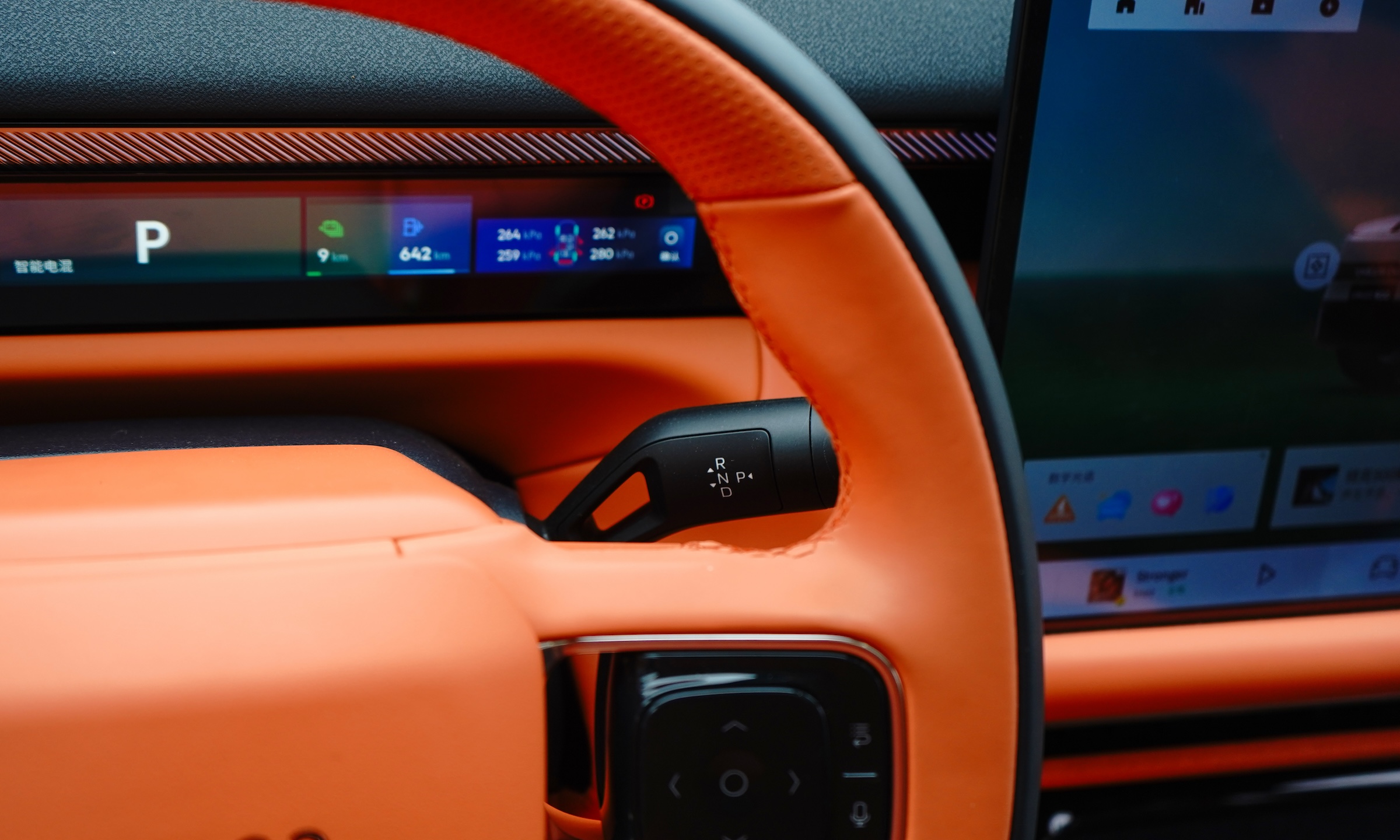 The cockpit's design follows a flat aesthetic with few physical buttons. The electronic gear selector is positioned behind the steering wheel.