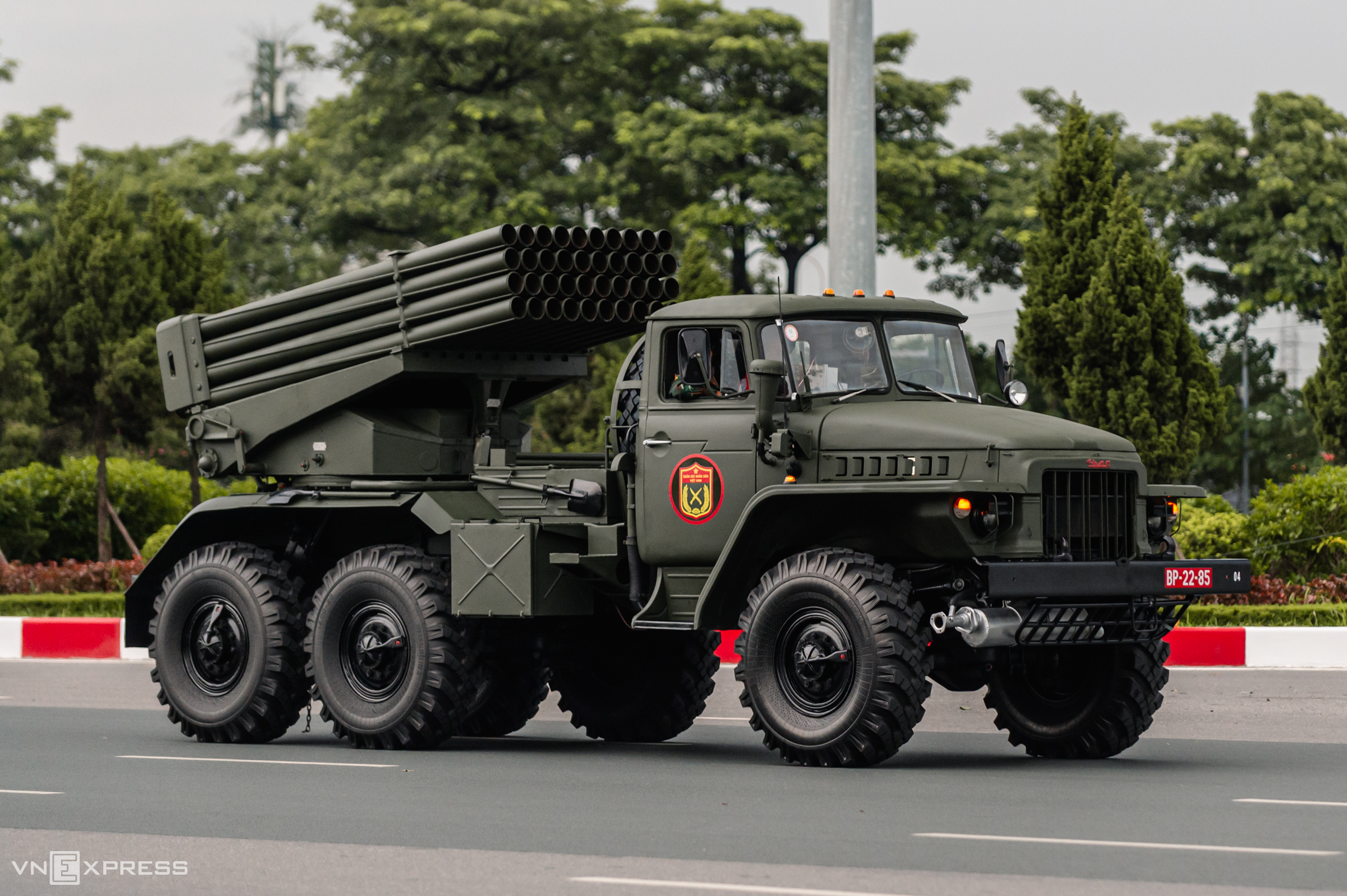 The BM-21 Grad multiple rocket launcher is considered a formidable weapon in the Vietnamese artillery arsenal. BM (Boyevaya Mashina) means "combat vehicle." It was designed in the Soviet Union between 1964 and 1983. The rocket system is mounted on a Ural-375D truck, powered by a 7-liter, water-cooled, V8 ZIL-375Ya gasoline engine generating 180 horsepower. It features a 5-speed manual transmission and a 2-speed transfer case. The vehicle has a top speed of 75 km/h, an operational range of 750 km, and can ford water up to 1.5 m deep.