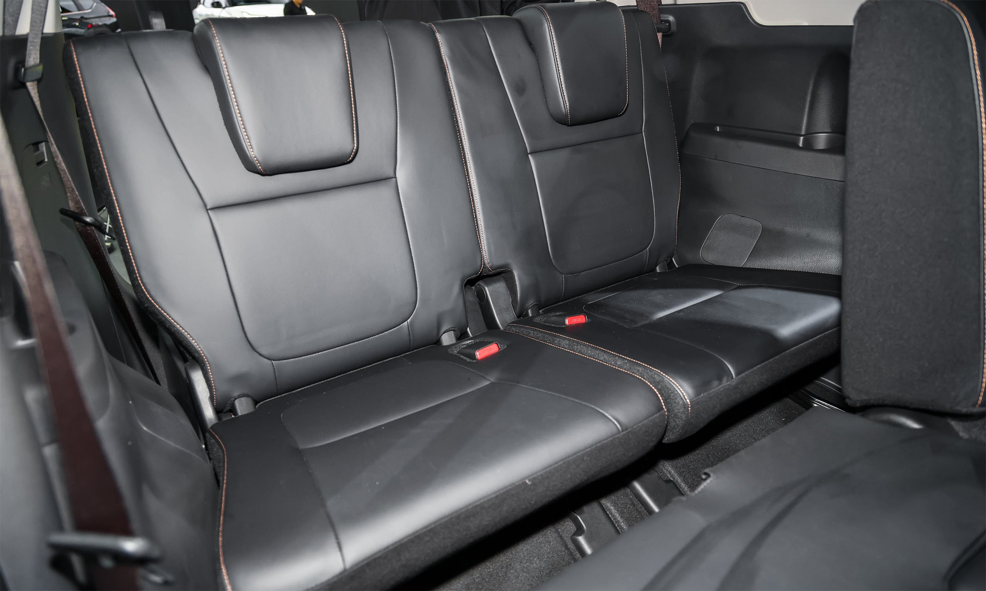 Black synthetic leather seats, decorated with contrasting copper stitching.