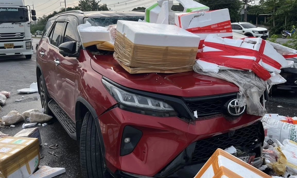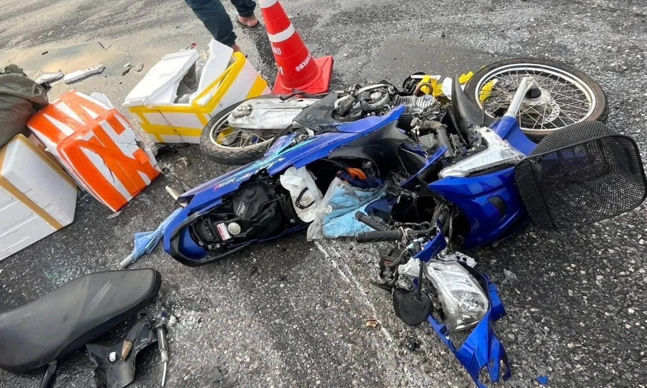 The female motorcyclist miraculously escaped with minor scratches, though her motorcycle was severely damaged. Seafood from the truck spilled across the road. The car with the dashcam suffered a broken windshield and minor damage to its hood and roof.