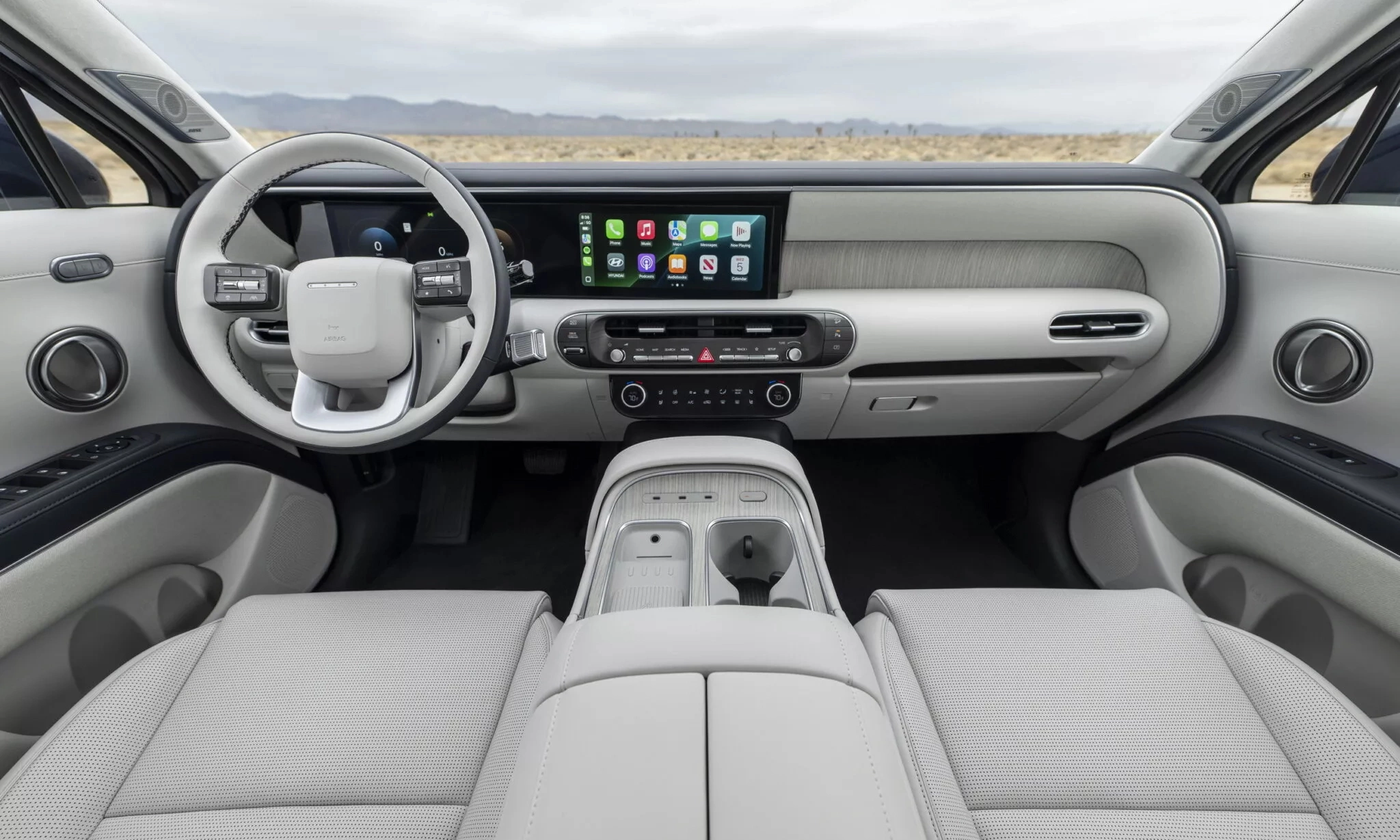 The dashboard, door panels, and center console of the new Palisade feature rounded elements. Like many other Hyundai products, the vehicle is equipped with dual 12,3-inch screens for the infotainment system and instrument cluster, offering wireless Android Auto and Apple CarPlay as standard.