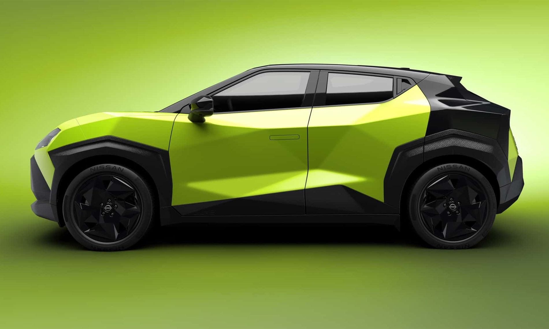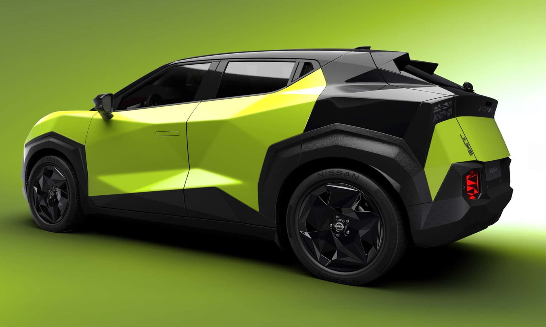 The new Juke's exterior boasts sharp, angular lines. It features a prominent black grille and distinctive headlights. Angular wheel arches are finished in black, contrasting with the lime green body. Like the current Juke, its rear door handles are integrated into the C-pillar. The LED taillights offer a unique design, complemented by an aggressive tailgate.