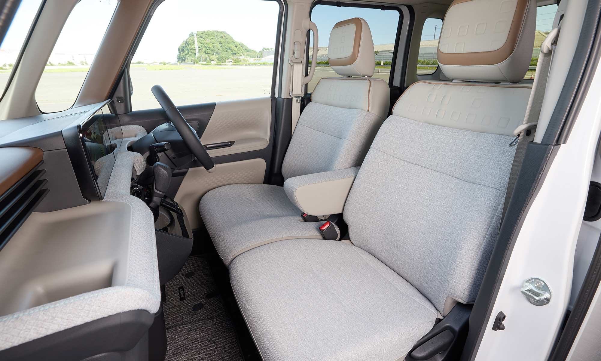 The interior has been redesigned with higher-quality materials. A new 12.3-inch touchscreen infotainment system is a first for a kei car.