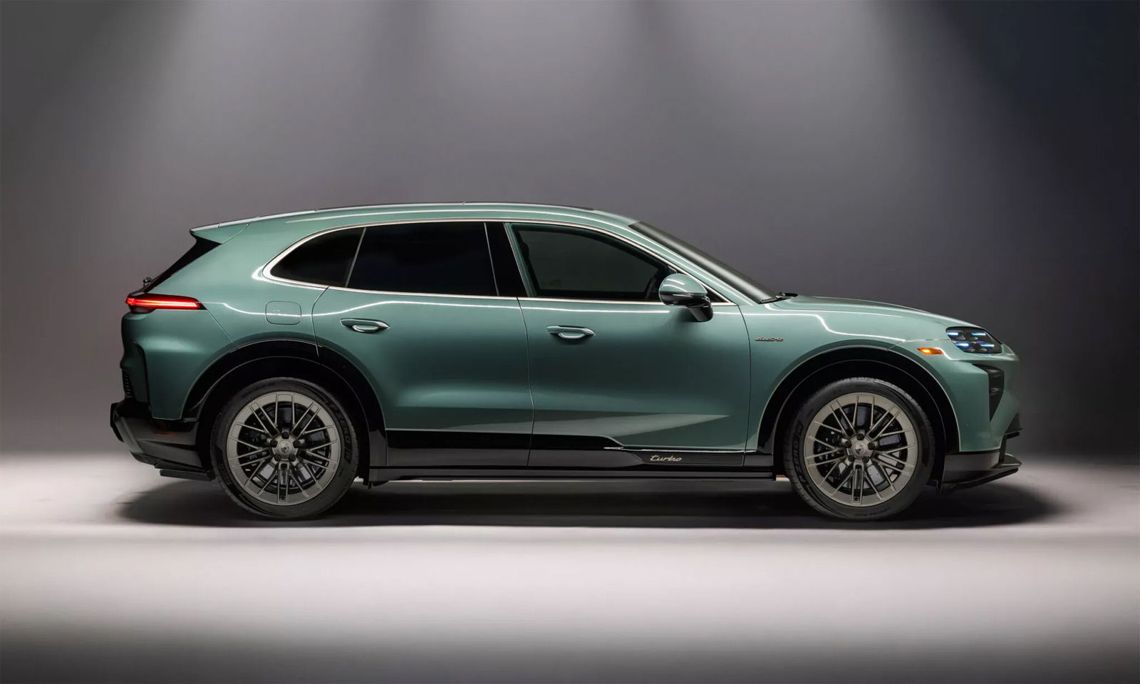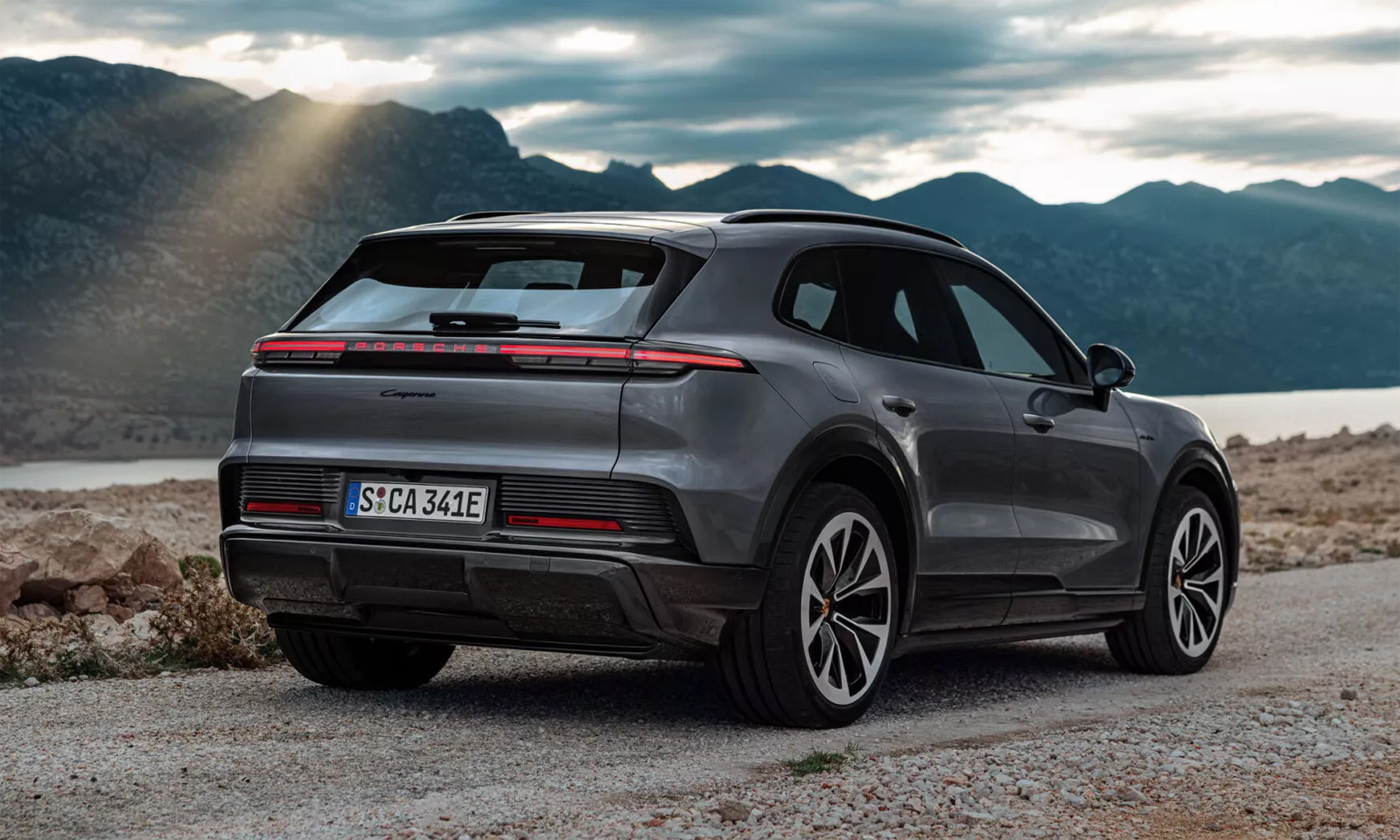 The Cayenne Electric's refreshed design incorporates several elements from the Macan EV, including a lower hood, slimmer headlights, sharper body lines, and frameless windows. The rear features 3D effect lights and an illuminated Porsche script, adding a distinctive touch at night. Turbo Electric versions are further distinguished by contrast details in a Turbonite color.