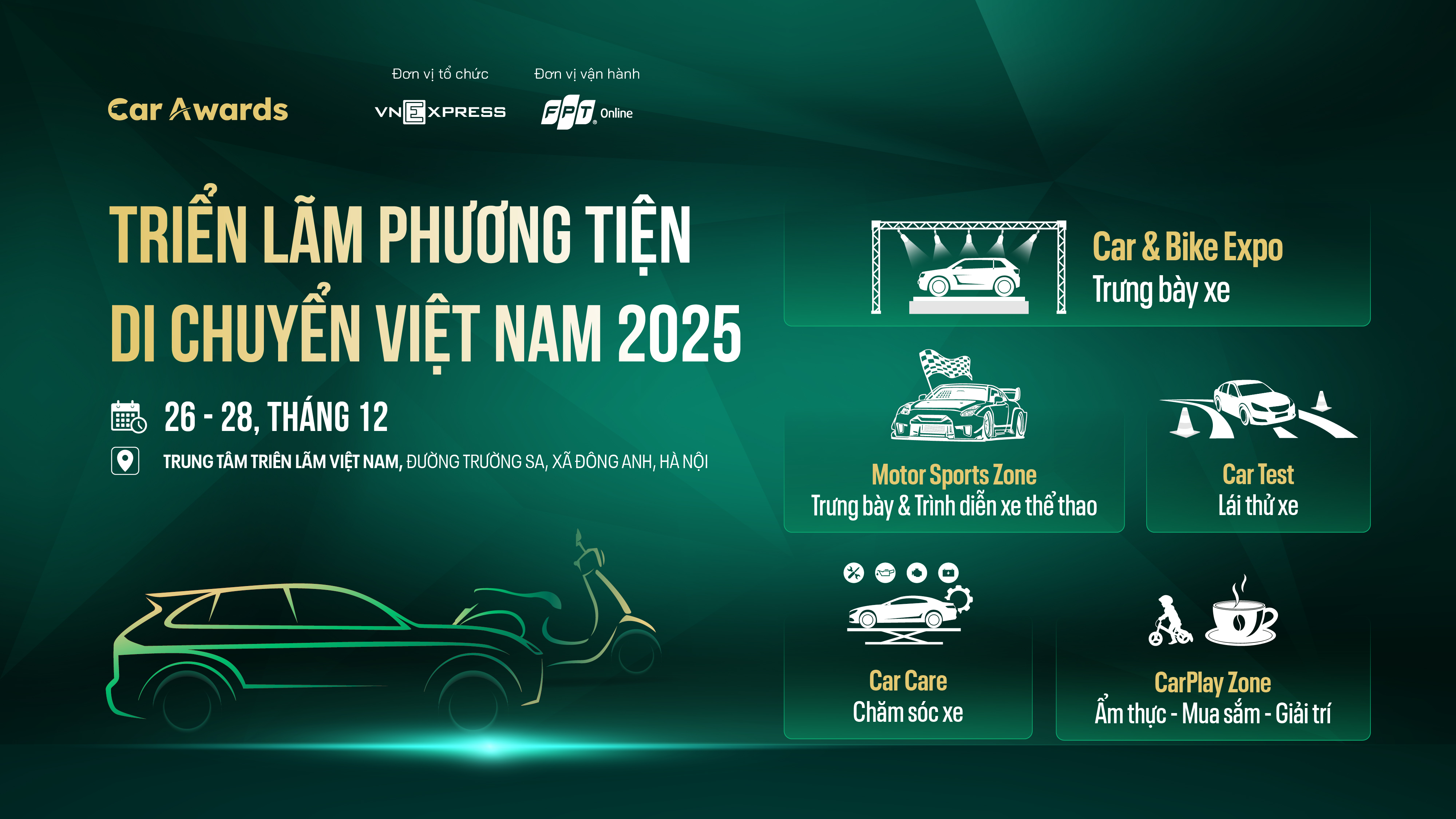 Car Awards 2025 will be held from 26-28/12 at VEC, as part of the largest Vietnam Mobility Show in five years. The exhibition will feature display areas for automobiles, motorcycles, and new technologies, a Motor Sports zone for showcasing and demonstrating sports cars, a car care service experience area, and a test-drive zone for the year's notable car models.