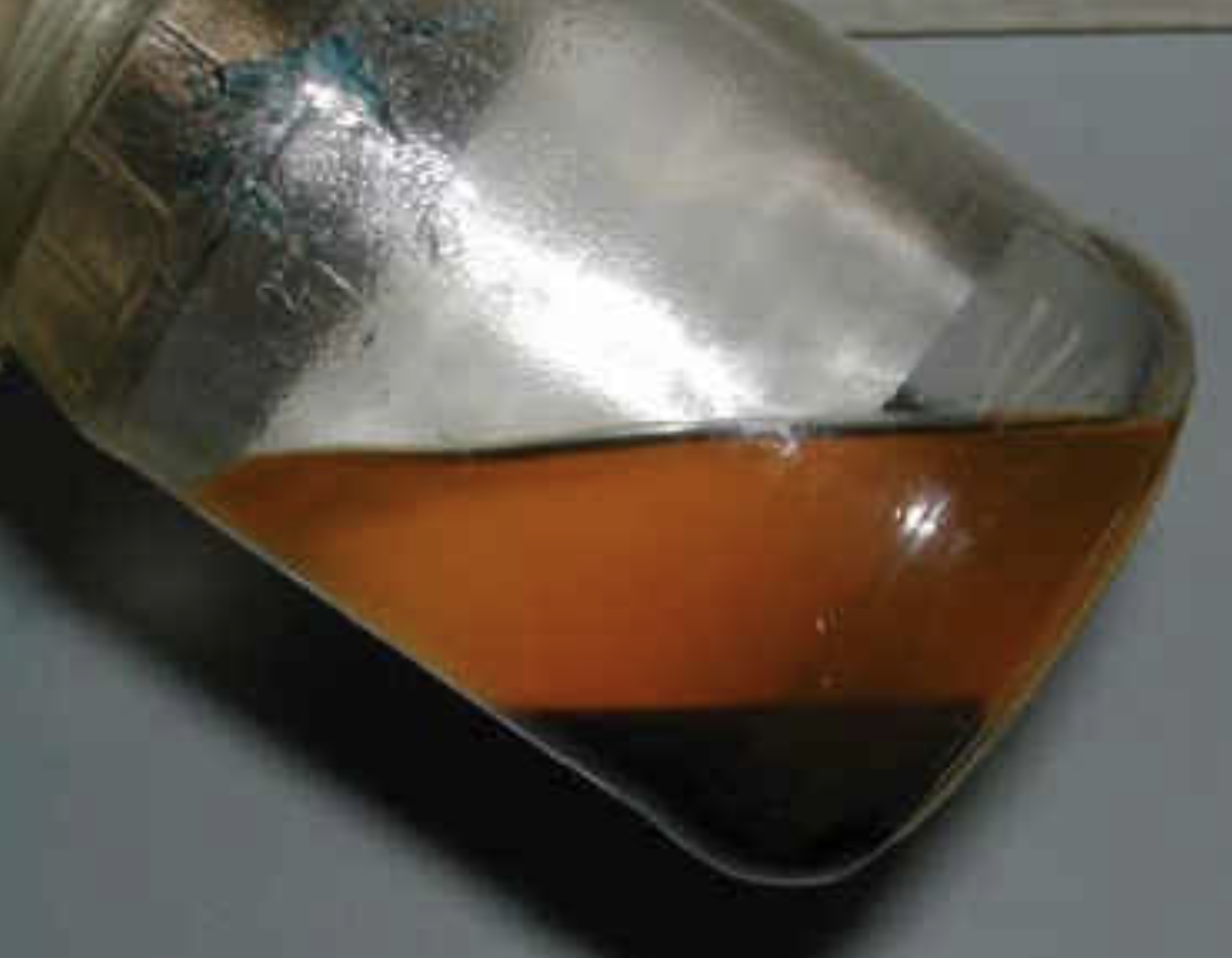 Phase separation in ethanol gasoline: the upper layer (orange) is gasoline with reduced ethanol concentration, the black sediment below is a mixture of ethanol and water. Photo: BP