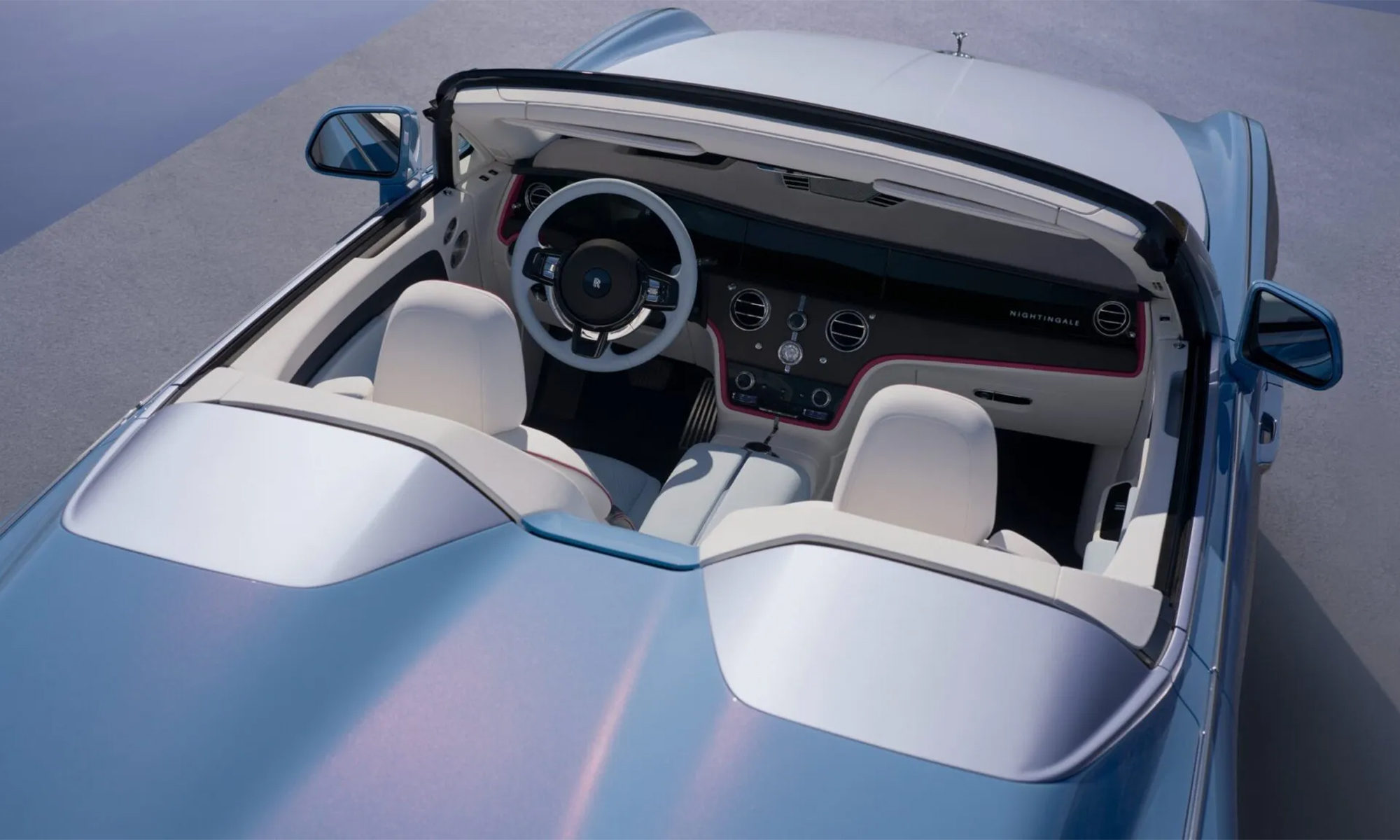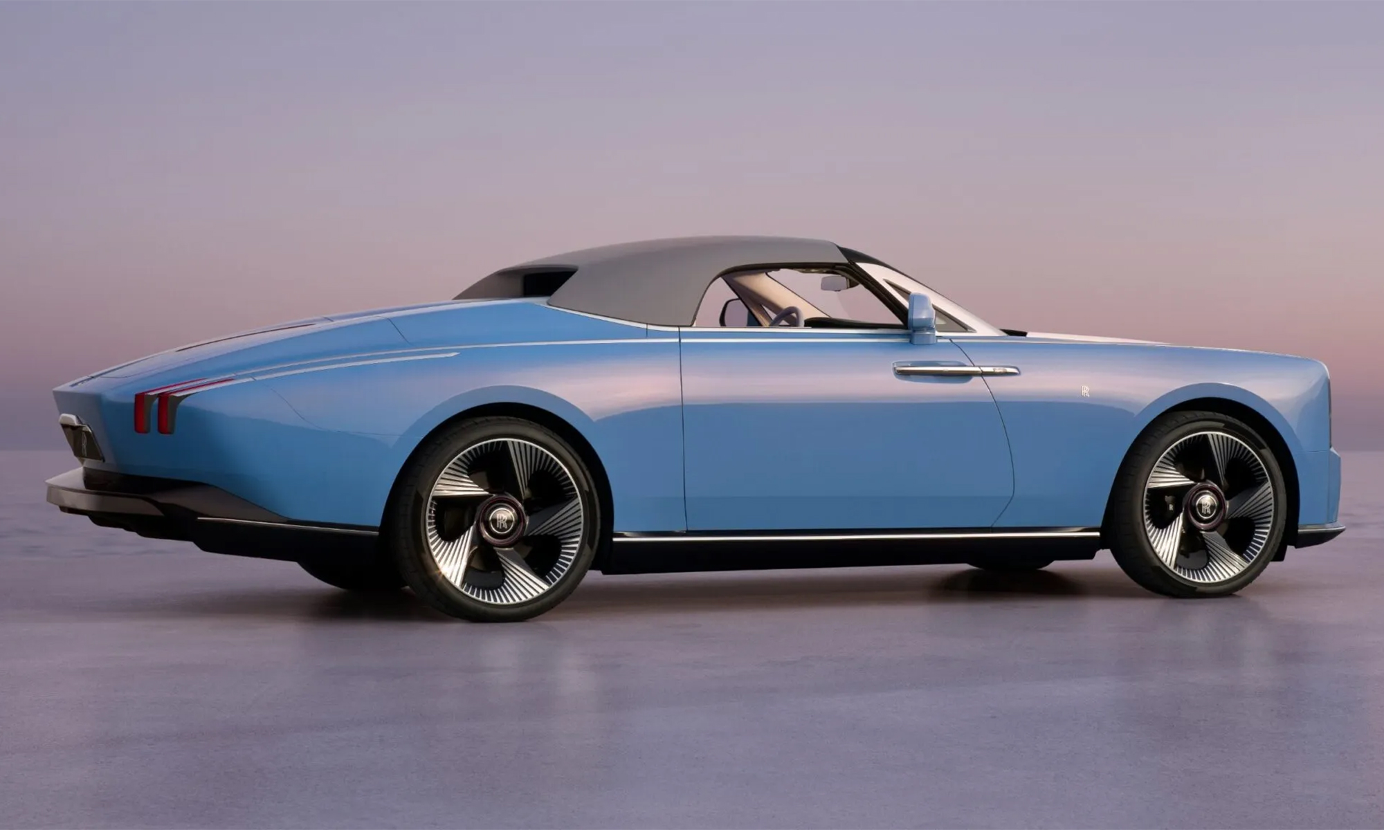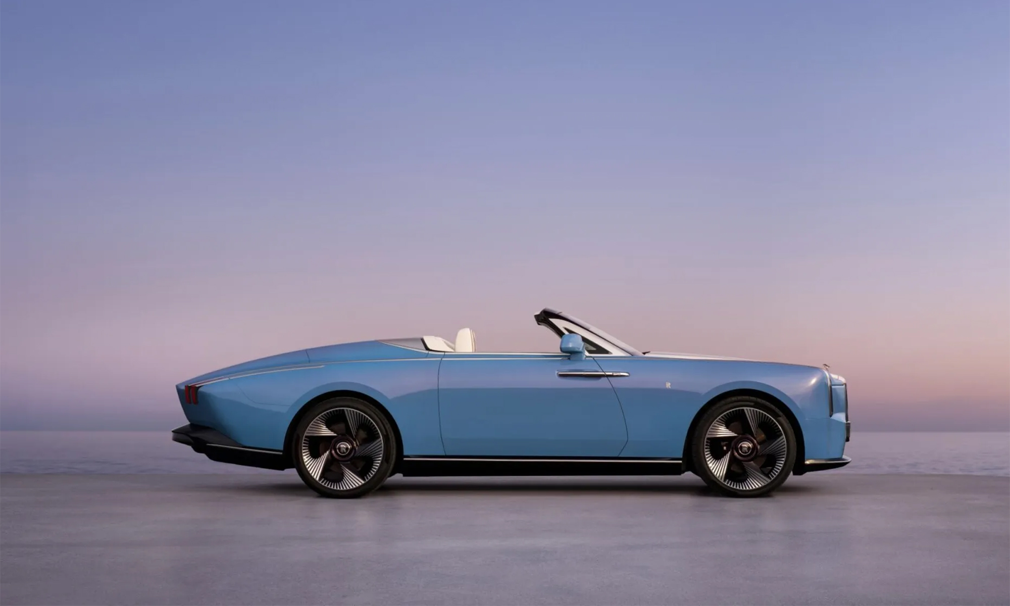 The car's exterior paint, Cote d'Azur blue with a hint of red, is complemented by silver accents and a matching soft top. This pale blue shade is inspired by the 1928 Rolls-Royce 17EX.