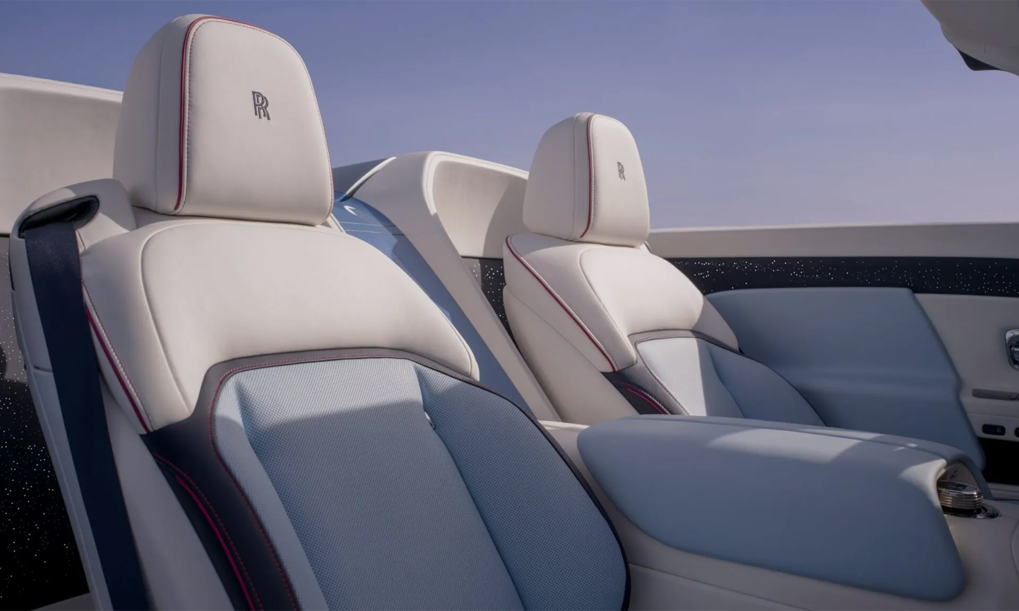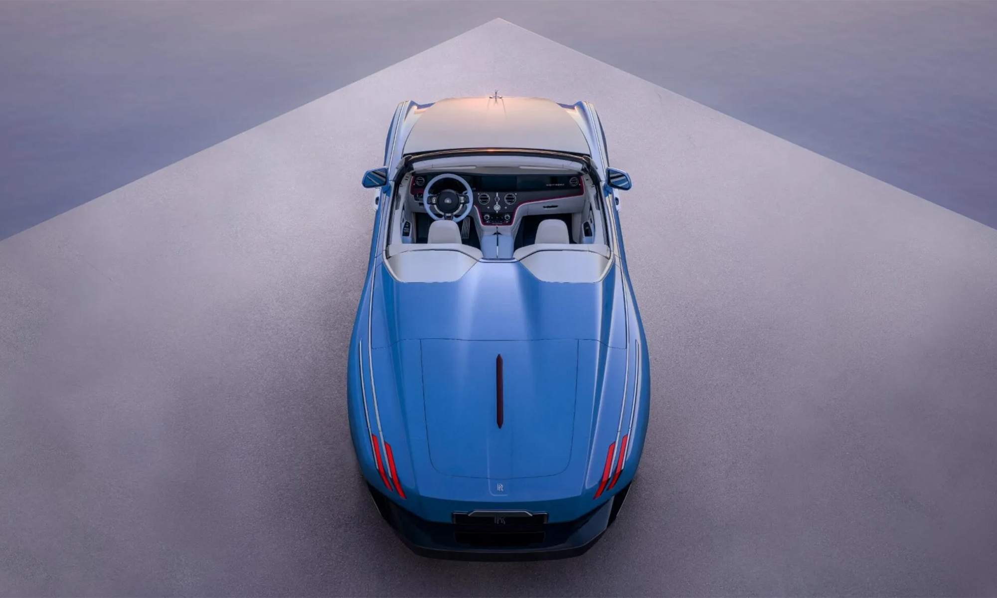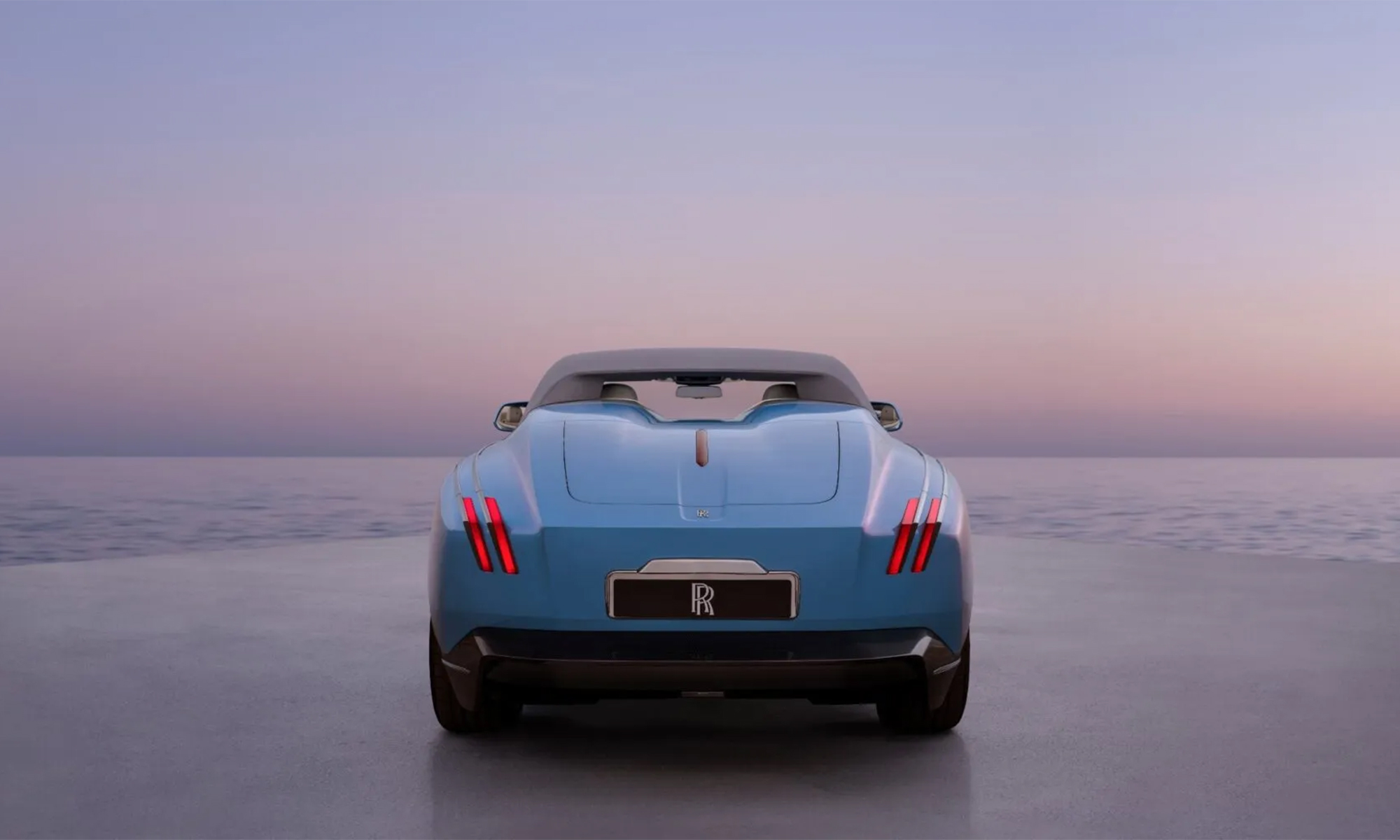 The car's exterior paint, Cote d'Azur blue with a hint of red, is complemented by silver accents and a matching soft top. This pale blue shade is inspired by the 1928 Rolls-Royce 17EX.