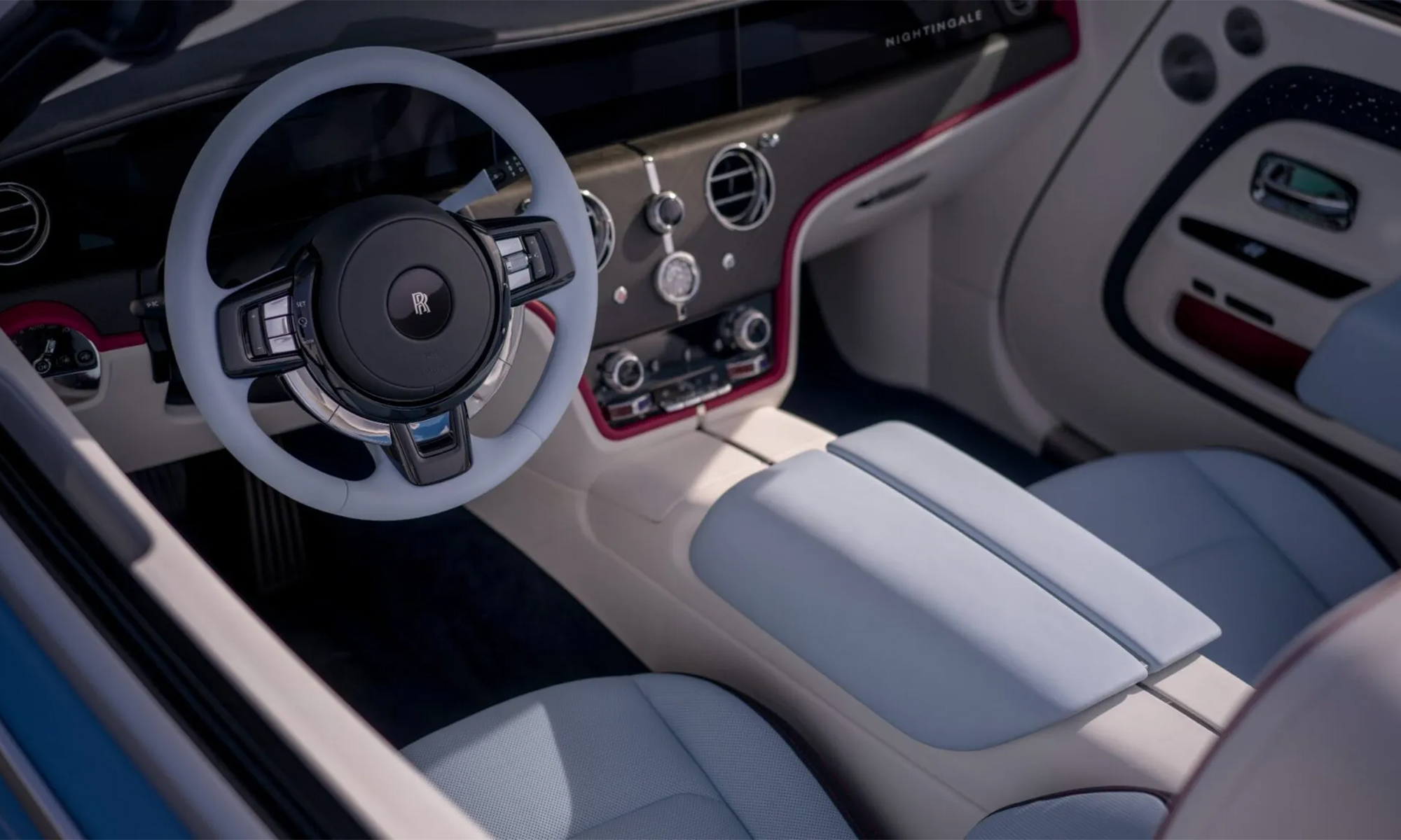 The signature Rolls-Royce dashboard, with dominant blue and white two-tone.