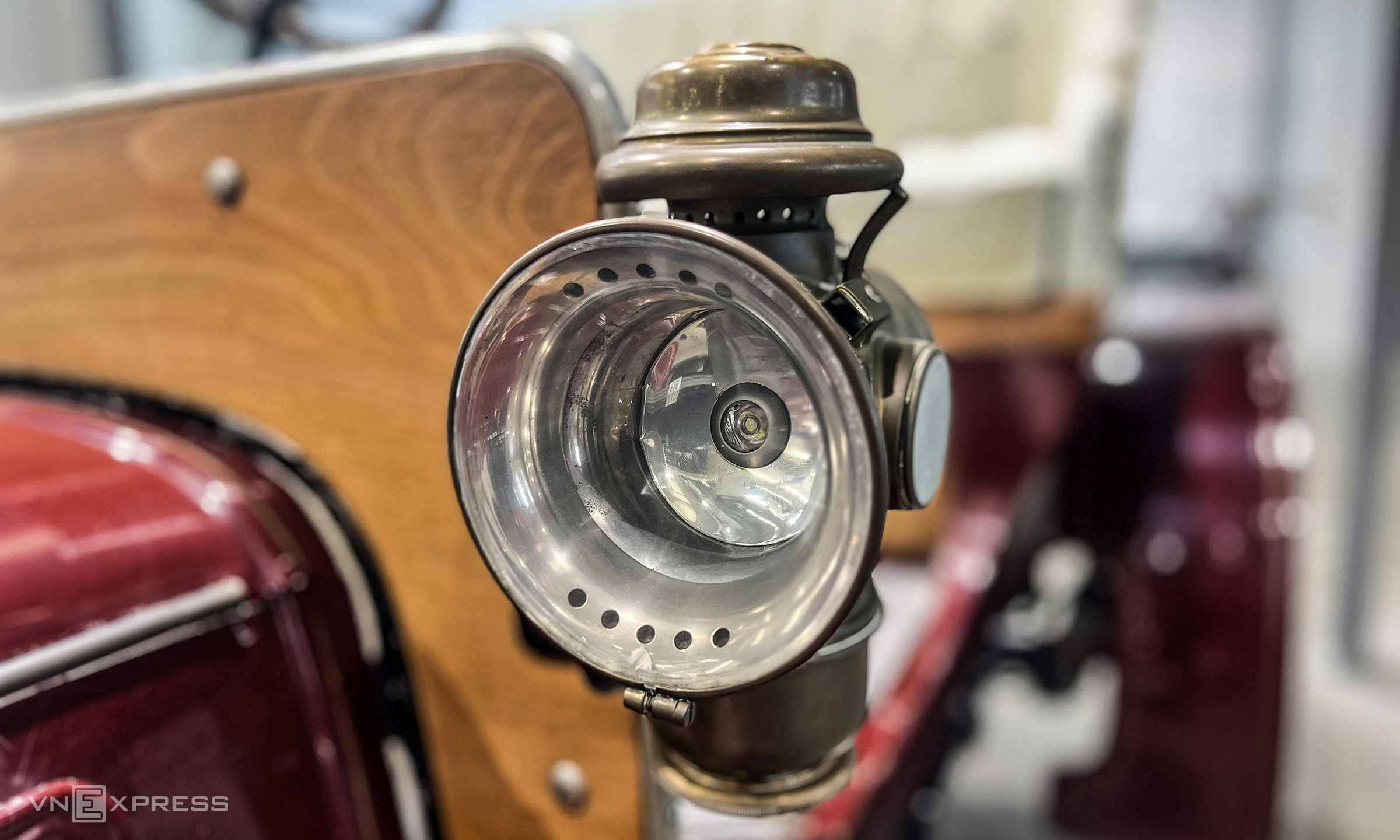Car models in the 1900s used oil, candle, or acetylene lamps for illumination. The Voiturette A featured optional acetylene lamps at the front and small oil lamps on both sides for lighting and night markers. To operate the acetylene lamps, the driver needed to prepare clean water in the upper tank and carbide stone in the lower tank. Opening the adjustment valve initiated a chemical reaction, producing acetylene gas. The driver then lit the acetylene gas at the burner tip inside the lamp with a match, which produced white light. Turning the light on/off or adjusting its brightness depended on the water's drip rate. Drawbacks of the acetylene lamp system included significant residue, requiring frequent cleaning or replacement, and the flame being easily extinguished by wind or rain.