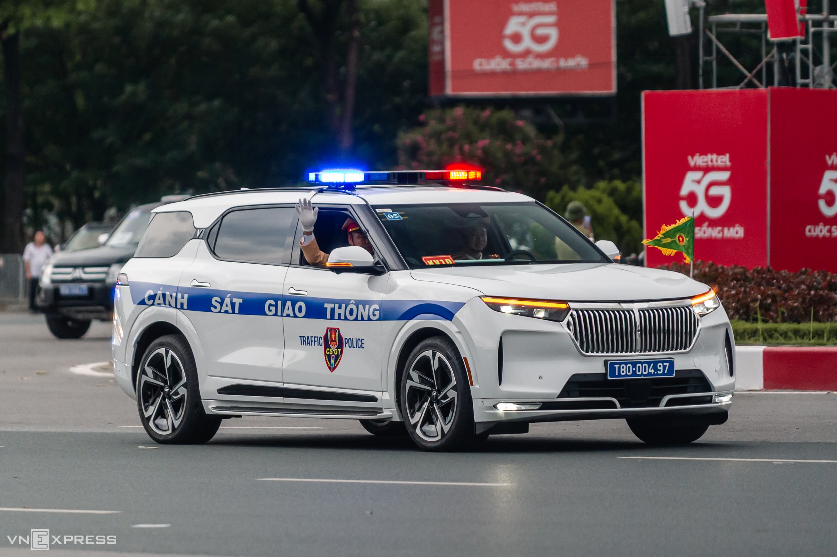 Traffic police vehicle: The VF9 is a full-size electric SUV from the Vietnamese manufacturer VinFast. A special version of the VF9 has been used by the Vietnamese Traffic Police in important events with modifications suited to its purpose, such as a hexagonal symbolic grille instead of the small, narrow horizontal bar on the standard version.