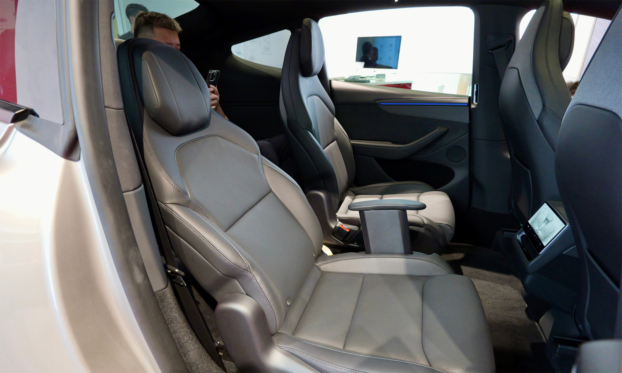 EV Insights focused on the Model Y L's third-row seats. While the second row features two independent seats with heating and ventilation, new speakers, and a unique power-adjustable armrest (which can be raised and lowered), the third row presents a different picture.