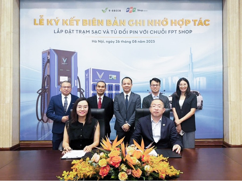 V-Green, a global charging station development company, and FPT Retail, a digital retail company, have signed a memorandum of understanding to develop a nationwide network of charging stations for VinFast electric vehicles. The project will be rolled out at FPT Shop stores this year.