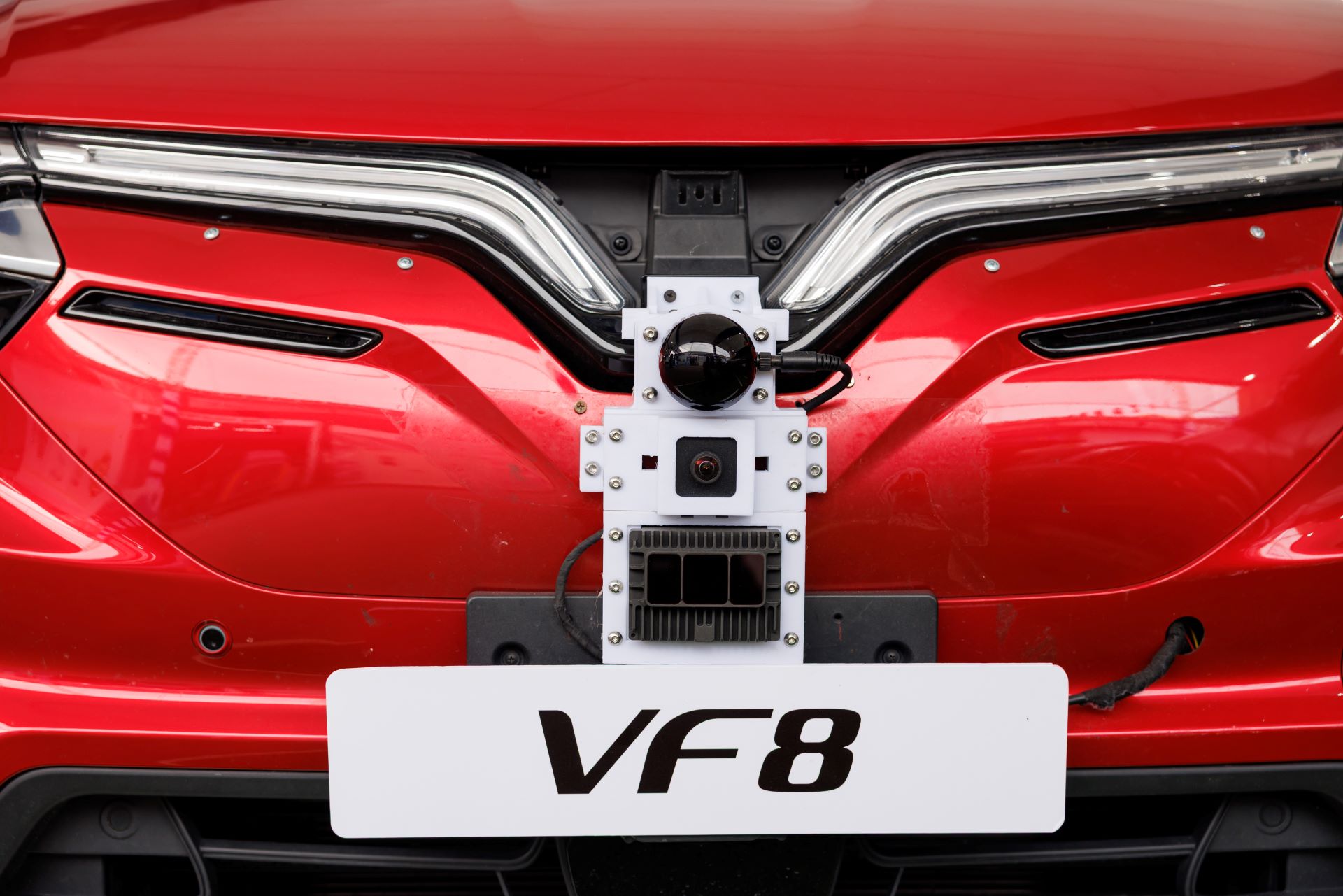 LiDAR sensors, radar, and cameras mounted on the front of the car. Photo: Tuan Vu