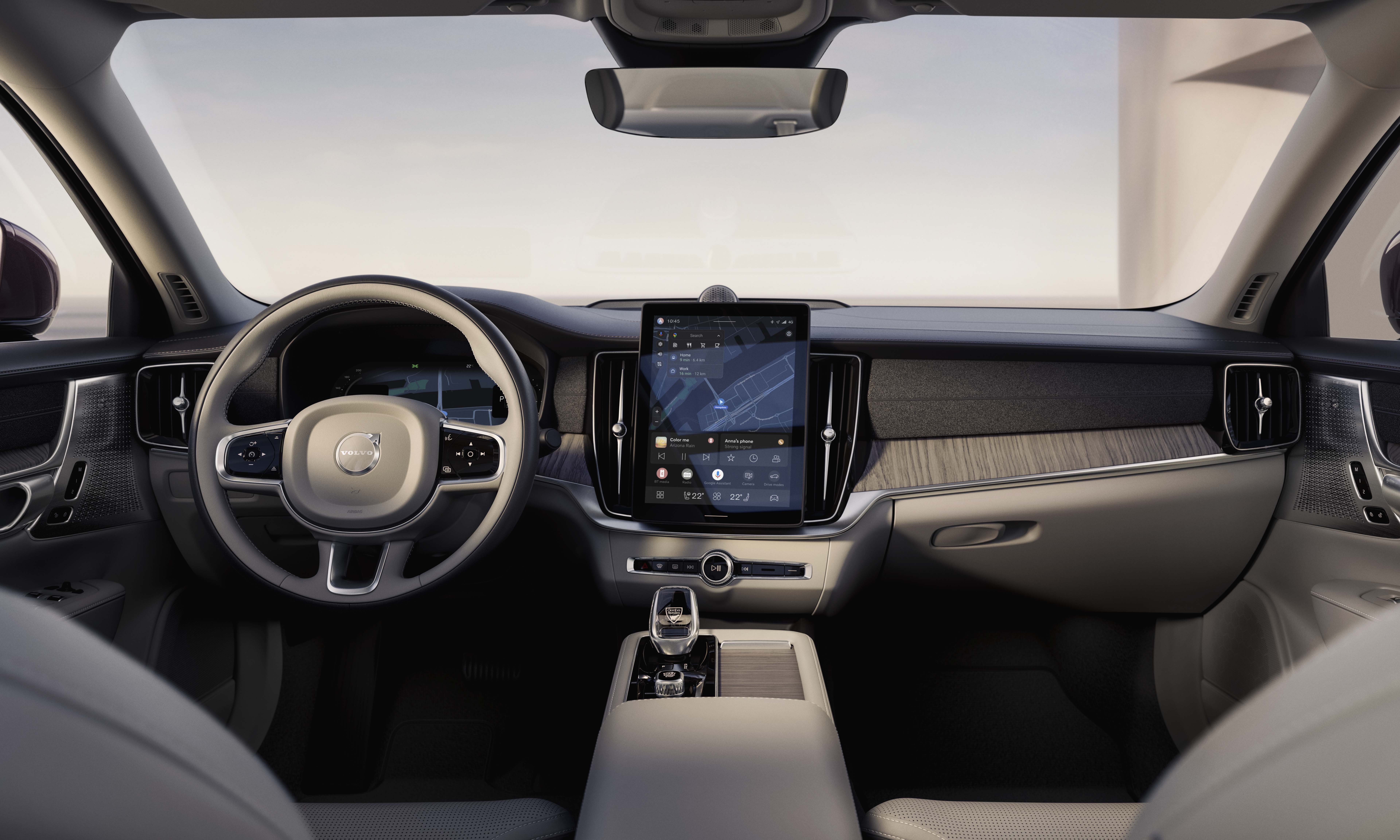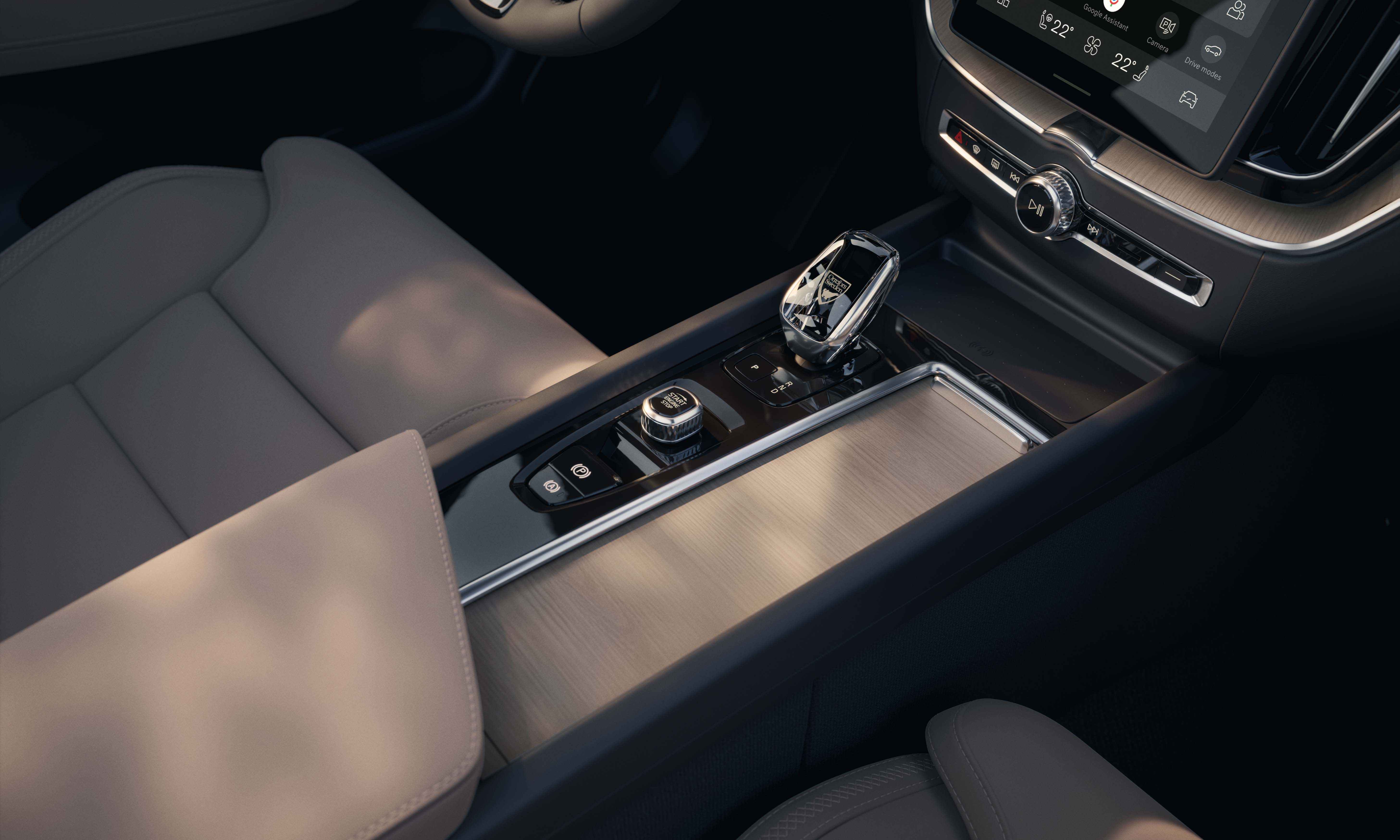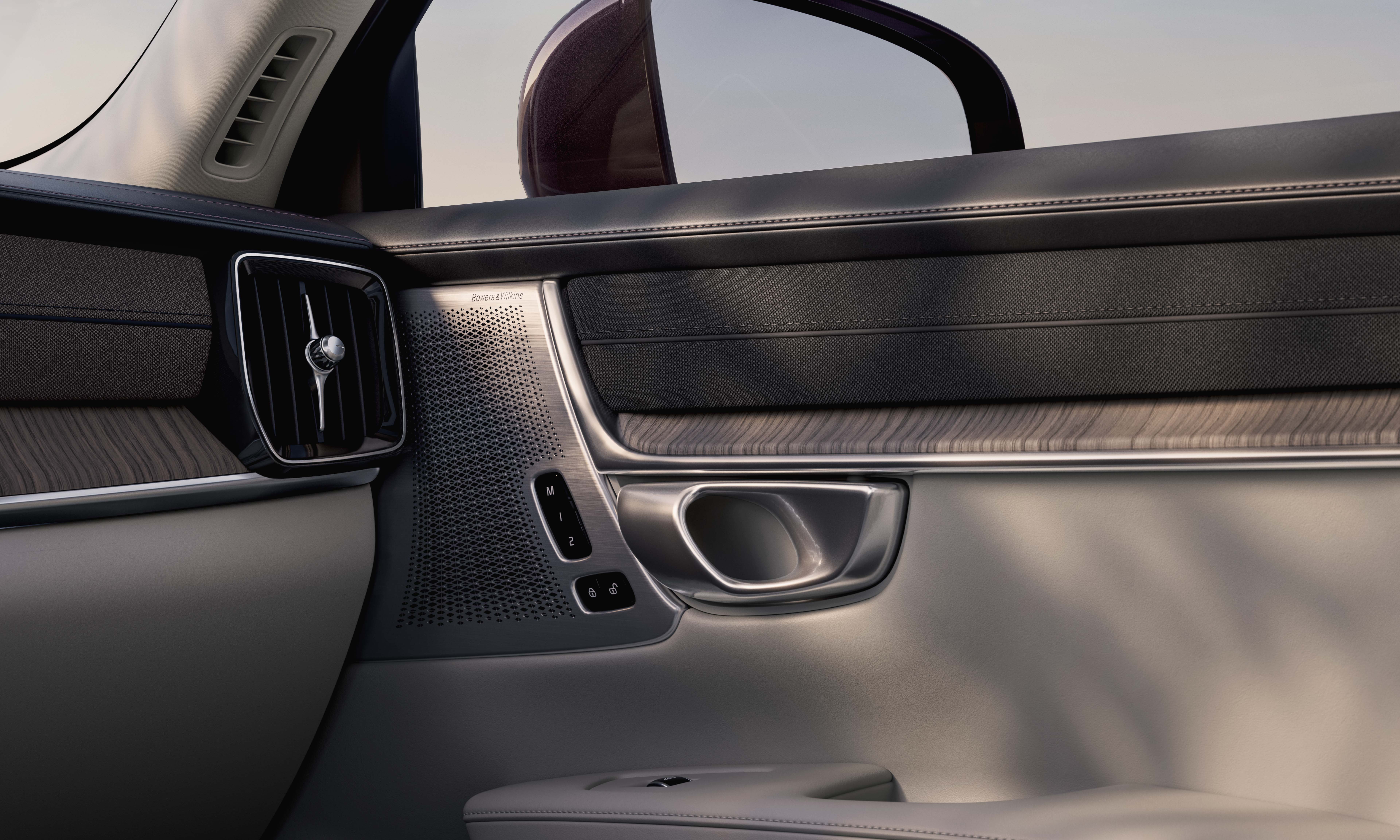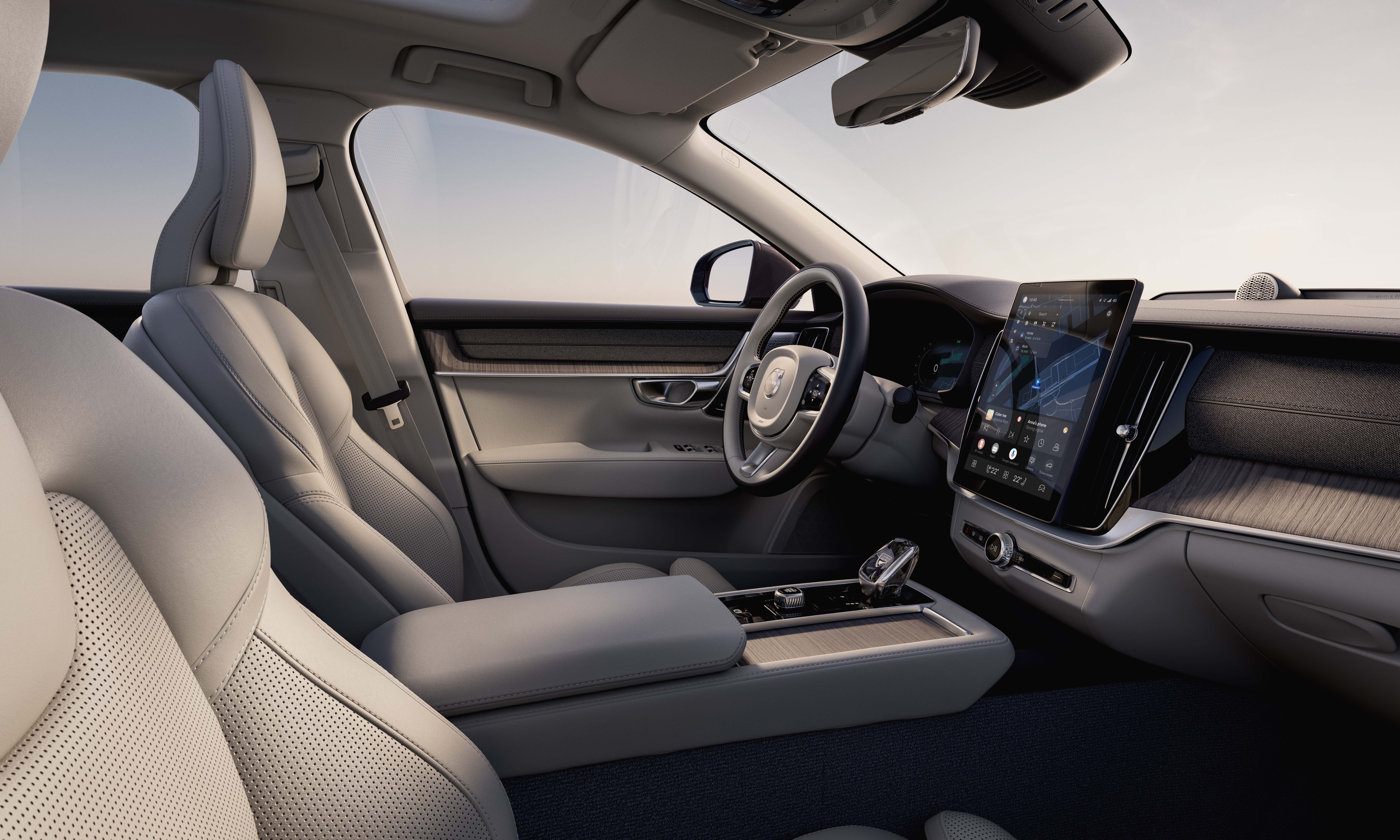 The interior of the 2025 Volvo S90 retains its distinct character, with wood and leather materials in subdued, elegant tones throughout the cabin. Luxury accents come from handcrafted details such as the crystal gear selector and vinyl leather on the dashboard. The infotainment screen in the S90 has increased in size from 9,7 inches to 11,2 inches. Volvo states that the screen's information and graphics processing performance is many times faster than before, thanks to the new-generation Snapdragon Cockpit platform and the Google Automotive Service (GAS) operating system. The vehicle continues to use the Bowers & Wilkins sound system.